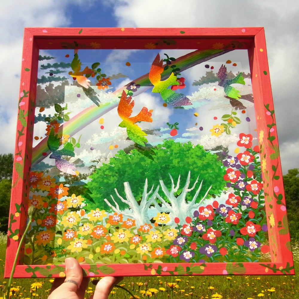 額縁の中だけで終わらないカラフルで楽しい世界。飾る場所を変えると作品の表情も変化する透明アート。窓辺で空を映せばさわやかに、ライトをあてれば影が出て幻想的に。
