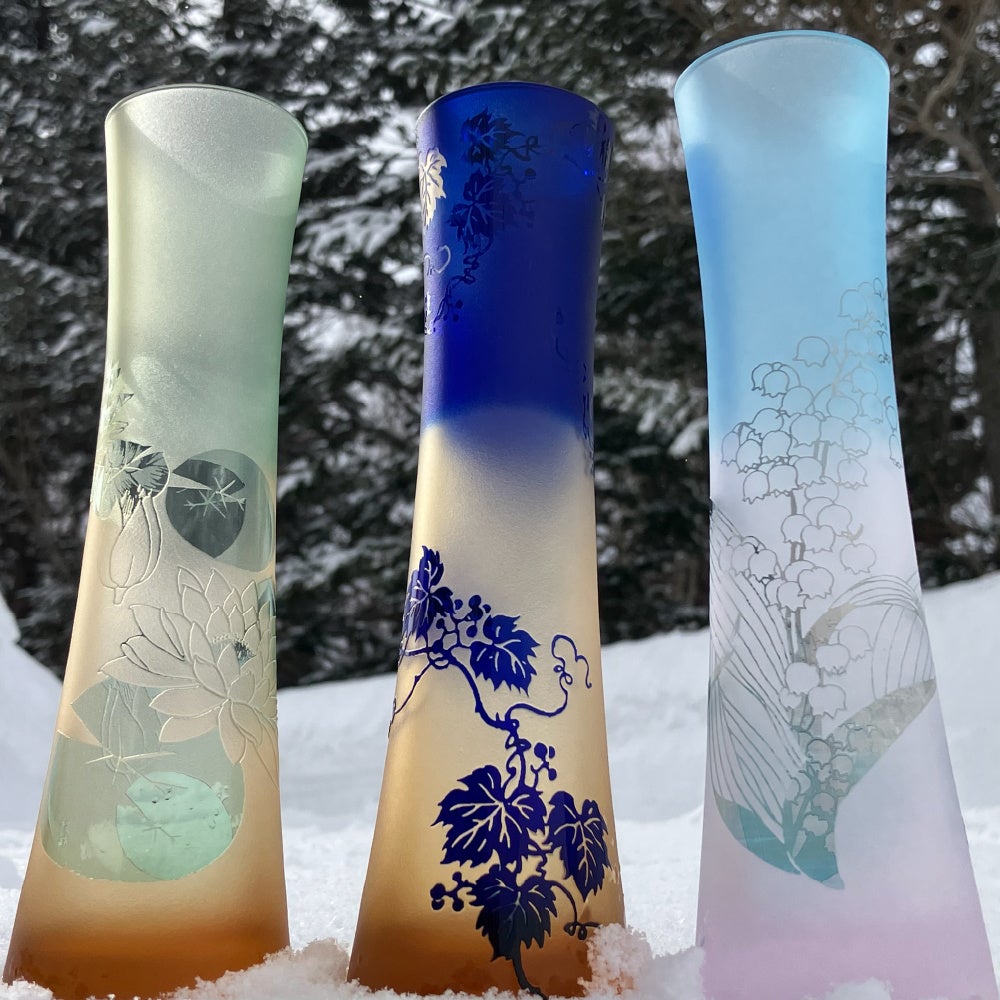 色鮮やかな2色のグラデーションの一輪挿し。サンドブラストによる彫刻ガラスを制作しています。色被せ硝子に植物などさまざまな模様を彫刻し、温かみのあるものに。