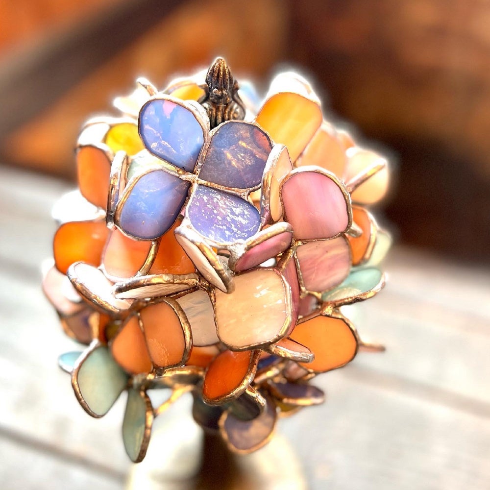 点けていても、消していても、違った表情を見せるあじさいランプ。ステンドガラス特有の混ざり合った色合いが美しく。暮らしを彩る“お守り”ステンドグラスをコンセプトに。
