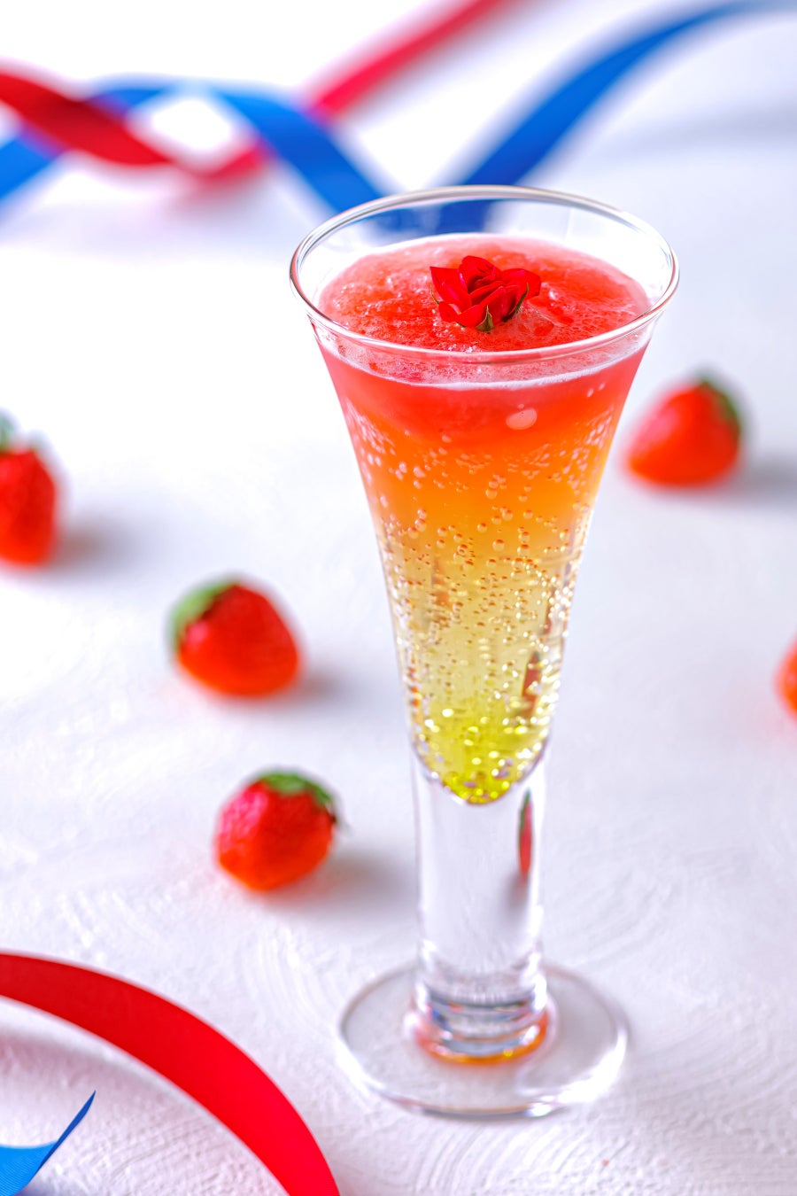 華やかな味わいのノンアルコールスパークリングワインに、甘みと酸味のバランスが絶妙ないちごとライチのシャーベットをあわせた一杯に仕上げました。