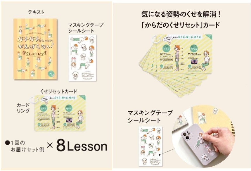 テキスト、毎月デザインの違うマスキングテープシールシート、気になる姿勢のくせを解消する「からだのくせリセット」カードなどが届きます。