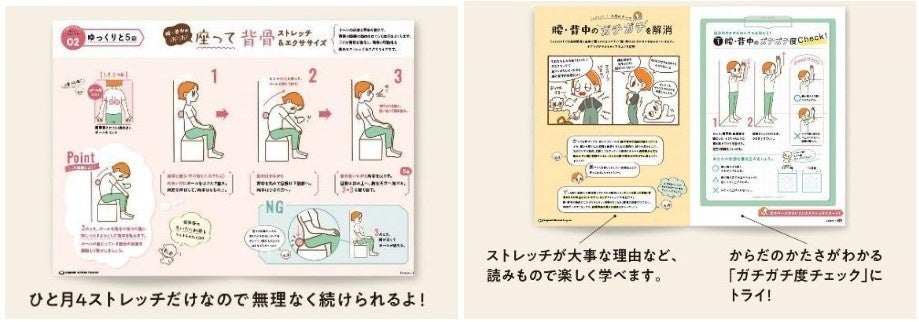 ひと月4ストレッチを、見やすいイラストで紹介しています。からだの硬さがわかる「ガチガチ度チェック」や、よりストレッチの効果を上げたり、原理を学べたりする読み物もあって、毎月楽しみながら学ぶことができます。