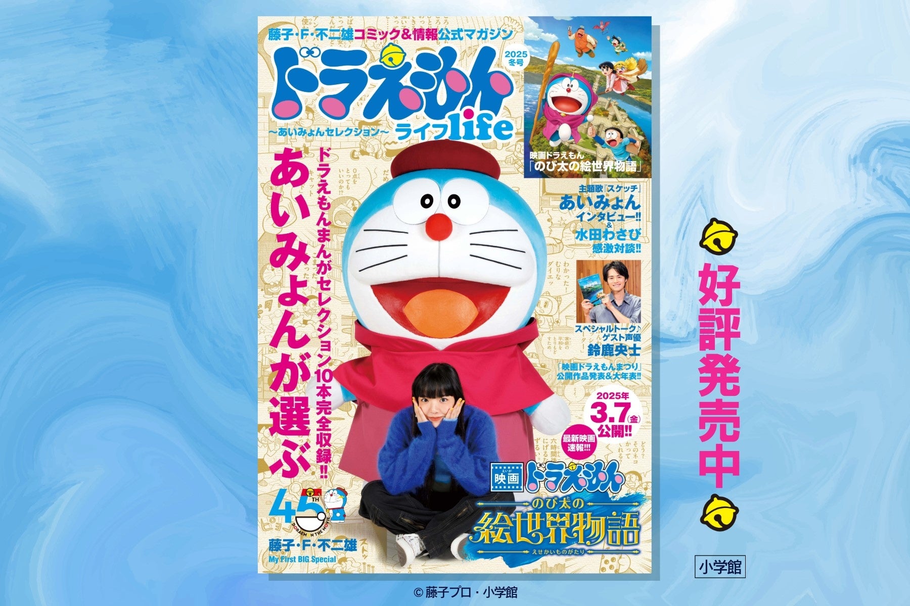 ドラえもんに関する最新情報を、厳選した漫画と一緒に楽しめる公式マガジン『ドラえもんライフ』。2024年12月27日(金)に発売される最新号には、45周年を迎える「映画ドラえもん」最新作『のび太の絵世界物語』(2025年3月7日公開)の主題歌を歌うあいみょんさんが登場!