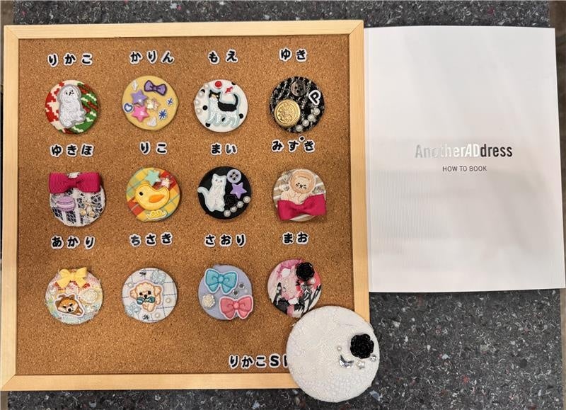 アップサイクルした衣類の端切れを利用して世界に一つだけのオリジナル⽸バッジをモデルタレントの佐々木 莉佳子さんはじめ、アンジュルムメンバー、つばきファクトリーメンバーの皆様に作成いただきました。