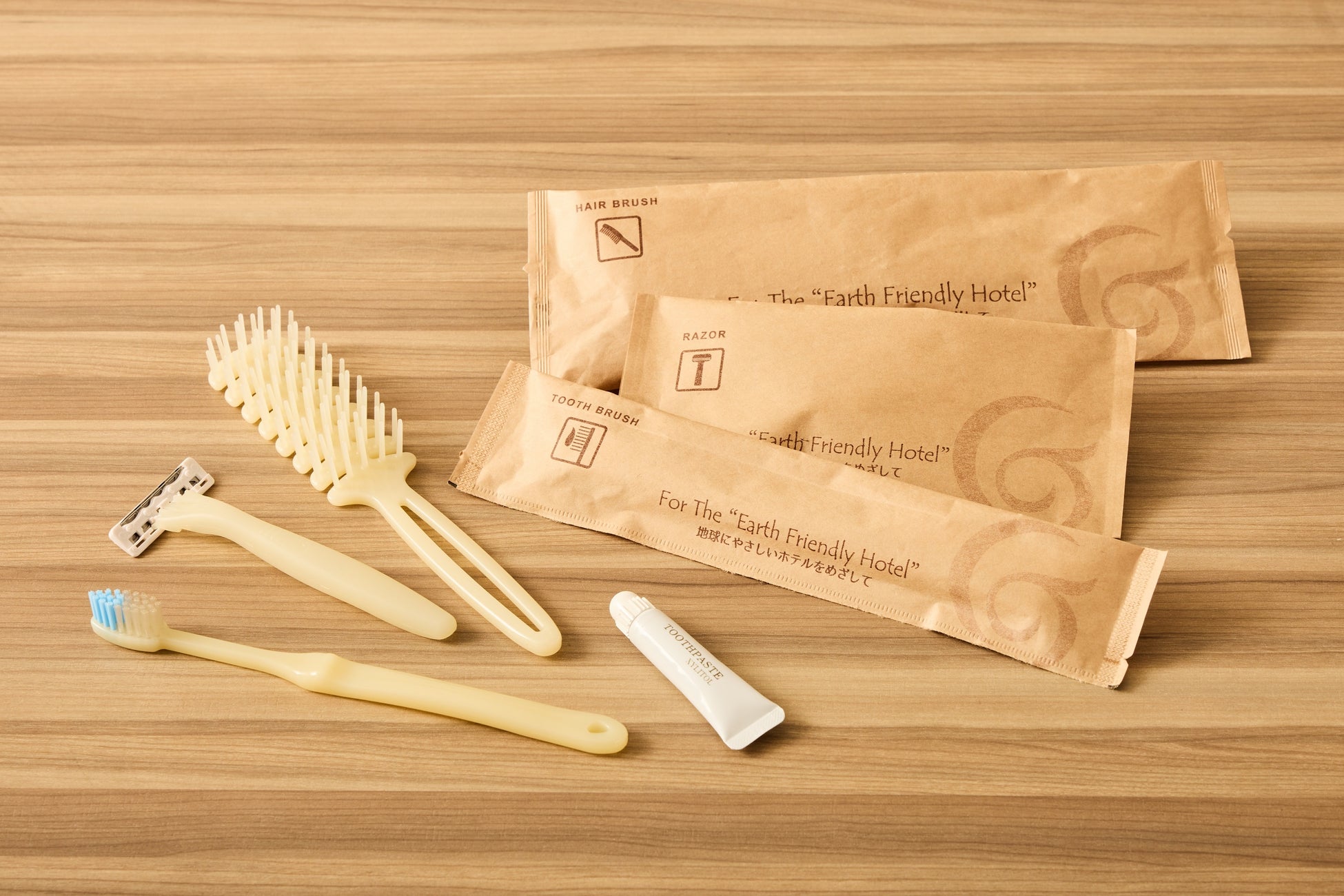 カネカが掲げる 「カネカは世界を健康にする。KANEKA thinks “Wellness First”.」 という考えは“地球にやさしいホテル・まちにやさしいホテル・ひとにやさしいホテル”を謳う当社と親和性があり、共に持続可能な社会の実現を目指して、客室アメニティのGreen Planet製品への変更に取り組んで参りました。2022年4月導入の歯ブラシを皮切りに、その後ヘアブラシも導入。このたび3つ目のアメニティとしてカミソリの導入に至りました。