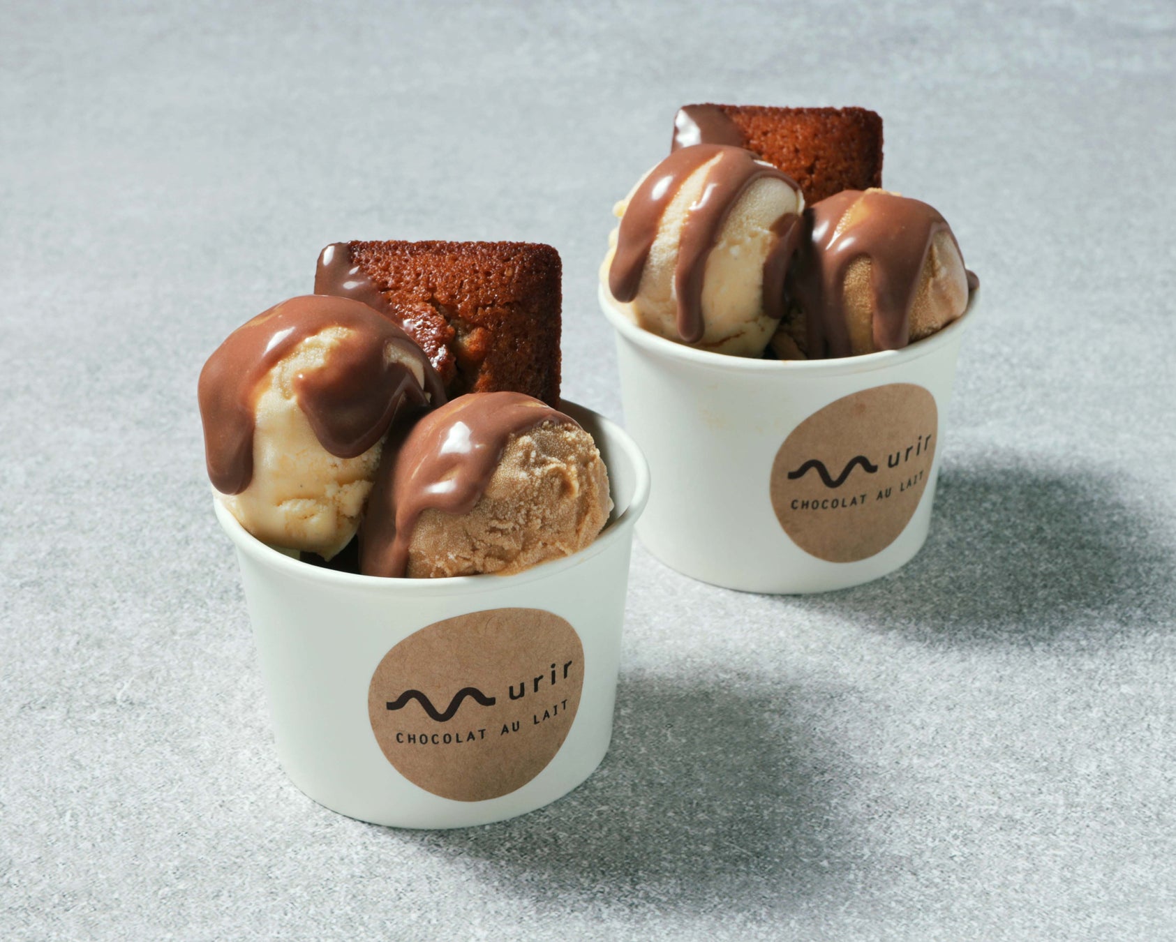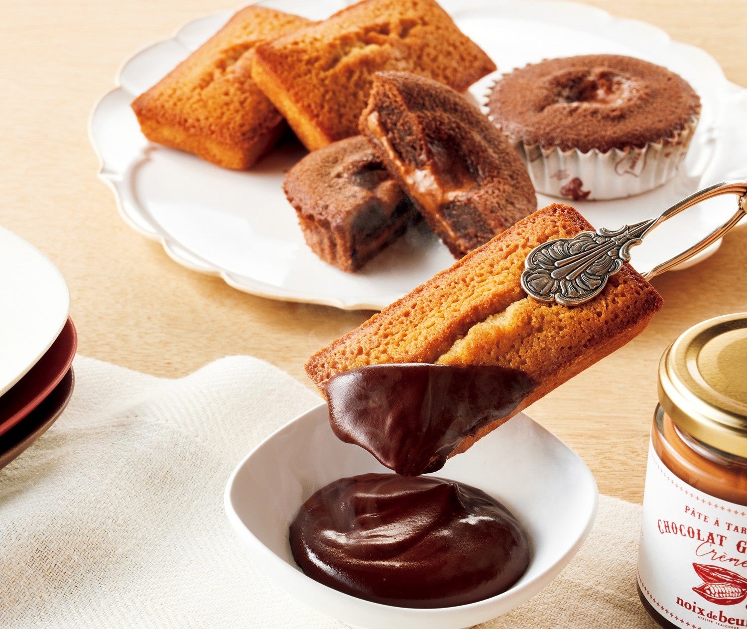 〈ノワ・ドゥ・ブール〉のフィナンシェを、チョコレートガナッシュや塩キャラメルクリームにディップして楽しめる特別セットが登場。スイス・フェルクリン社のオリジナルチョコレートを使った〈ミュリル〉とのコラボによるフォンダン風マドレーヌもご一緒にお届けします。