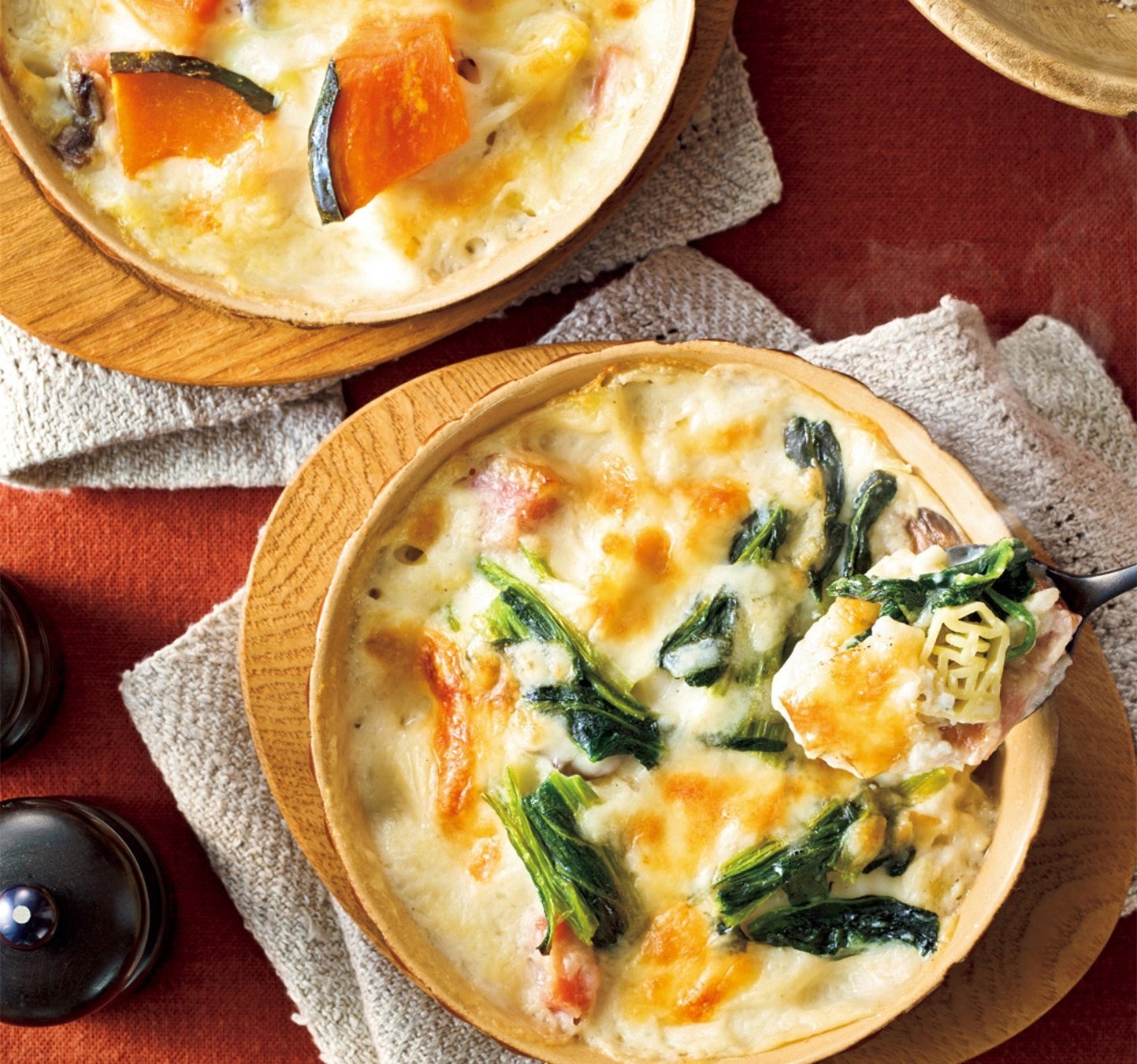 山形県産の素材をふんだんに使った、心も身体も温まる今冬限定グラタンセットが登場。甘みとコクが際立つ伝統野菜“赤根ほうれん草”のグラタン、濃厚な甘みが特徴の真室川流域で収穫されたかぼちゃのグラタンの2種をセットにしました。庄内豚のベーコンや将棋コマ型パスタなど、山形ならではの具材も加え、チーズやホワイトソースと野菜が絡み合う絶妙なハーモニーをお楽しみいただけます。