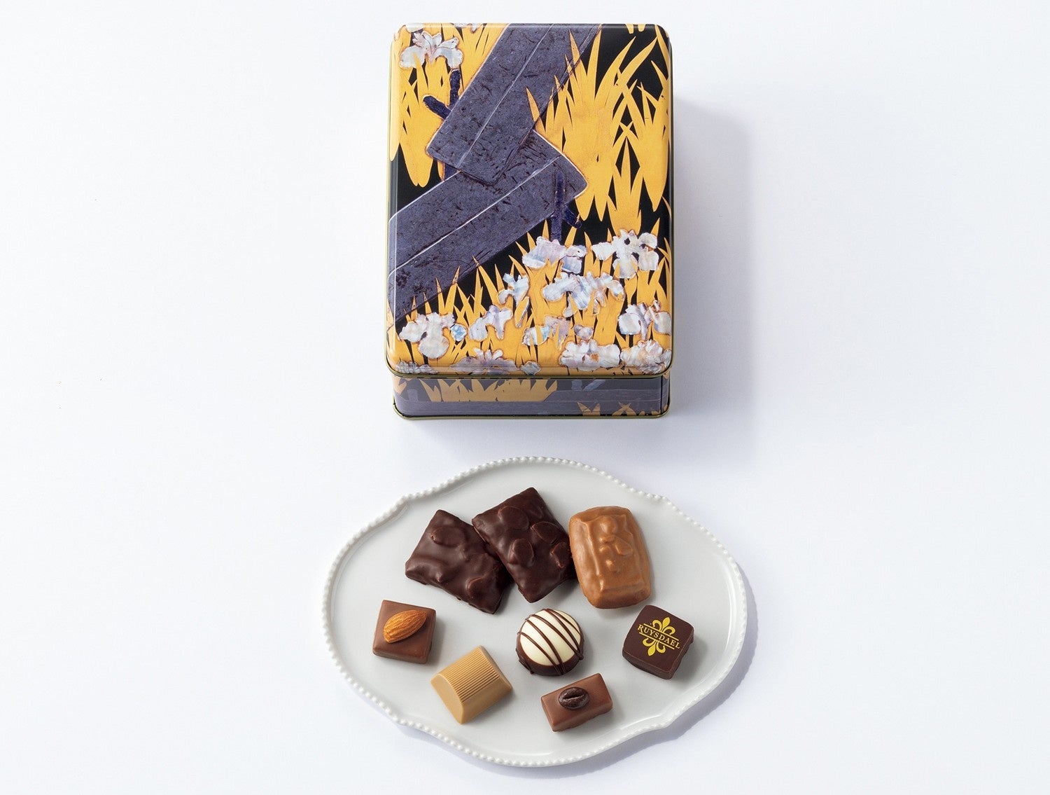 伊勢物語に登場する三河国八橋の情景を題材にした硯箱は、光琳ならではの繊細な感性と緻密な計算に基づく大胆な造形が魅力の作品。香ばしいナッツやフルーツを使った奥深い味わいのチョコレート、リーフパイなど、バラエティ豊かな詰め合わせでご用意しました。