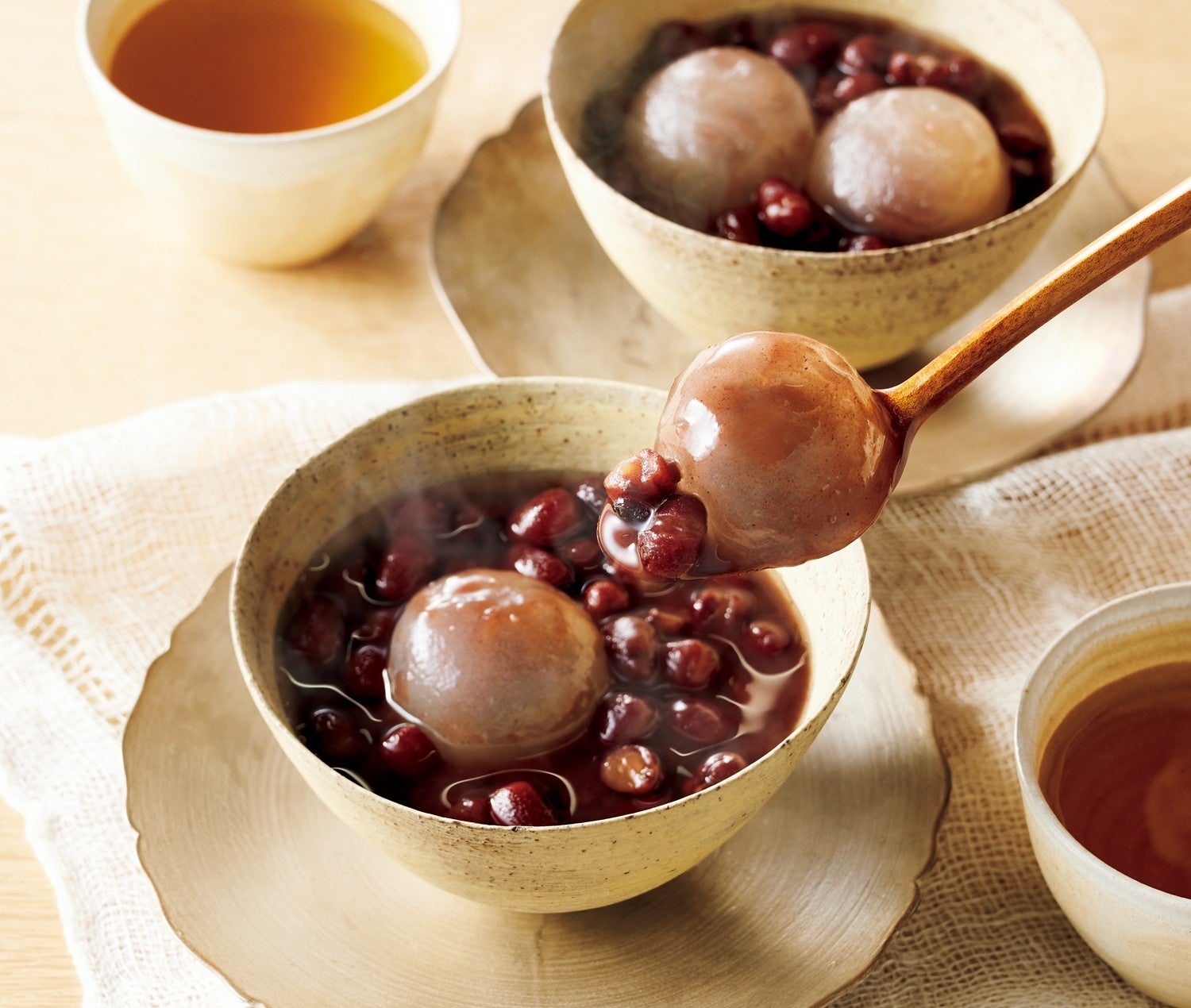 〈森八〉が手間を惜しまず仕上げたこだわりのぜんざいが登場します。小豆は粒感と風味に優れた能登大納言を贅沢に使用し、餅代わりの宝達葛の葛玉には、香ばしい加賀棒茶の餡をしっかり詰め込みました。