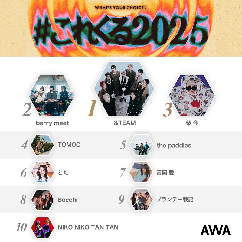 年始恒例のAWAユーザーが選ぶ!2025年にくるアーティストを発表!1位は9人組グローバルグループの&TEAM、2位は活動2年目のスリーピースバンドberry meet