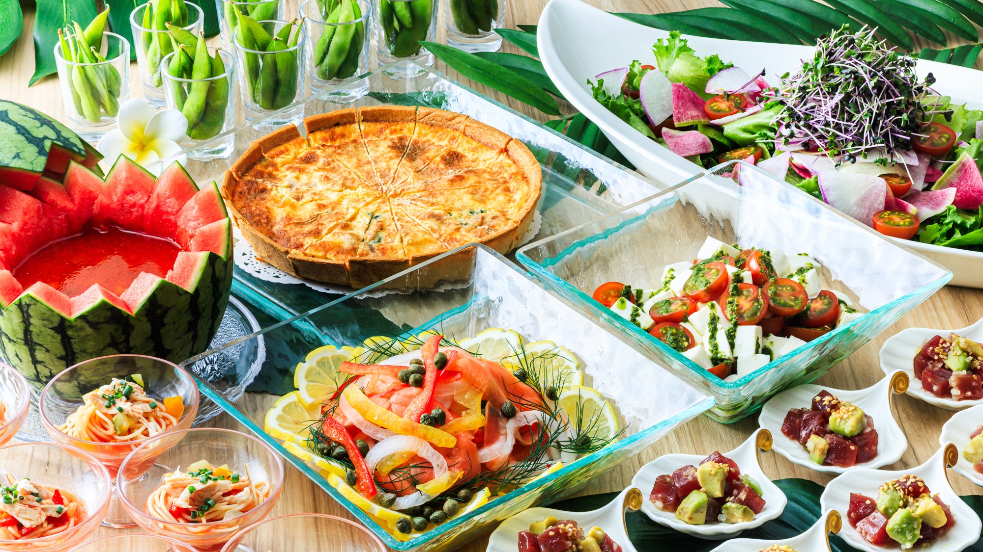 マグロとアボガドのポキ、スモークサーモンと彩り野菜のマリネ、スイカのカッペリーニ、冷製豚しゃぶ、サラダバー、アクアパッツァ、リゾットコロッケのチーズ焼き、シーフードグラタン、ポークスペアリブ、仔羊のロースト、海老のチリソース、飲茶、握り寿司、しらす小丼、冷製そば、ビーフカレーほか、パン・フルーツ・スイーツ各種