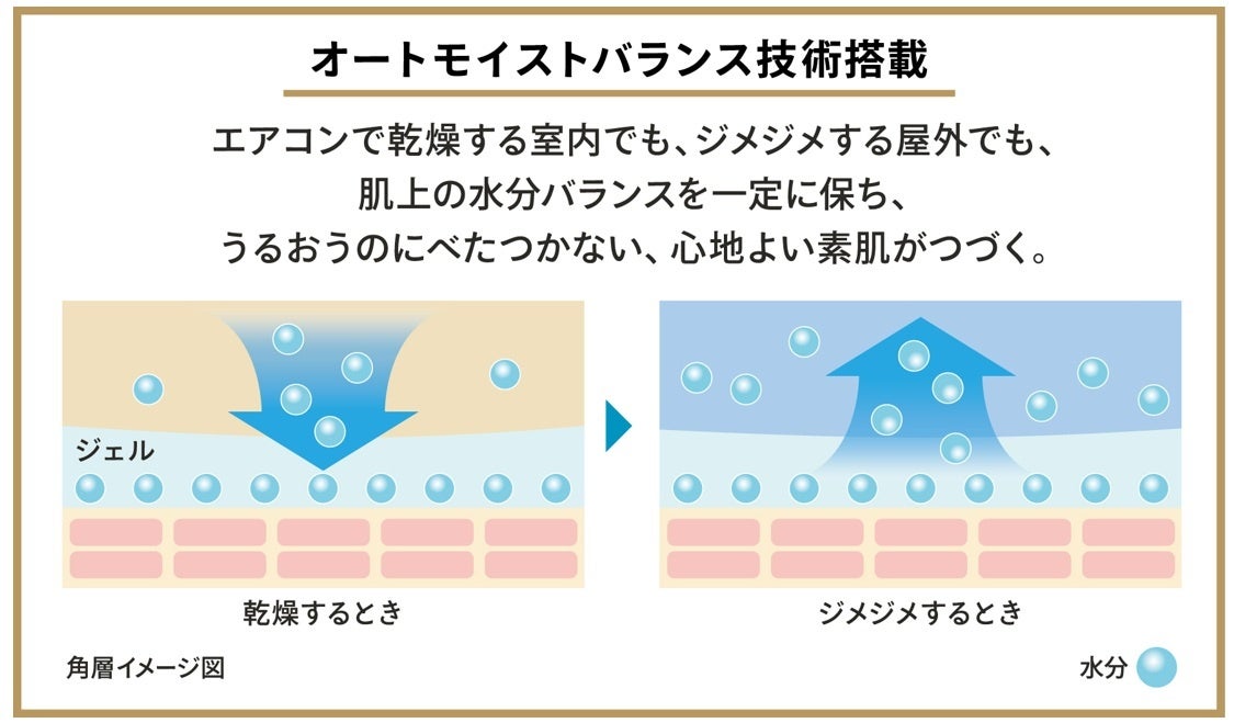 「アネッサ パーフェクトUV スキンケアジェル NB」には「オートモイストバランス技術」が搭載されています。「オートモイストバランス技術」とはアネッサ独自の技術であり、湿度変化に応じて肌上の水分バランスを一定に保つことが出来ます。湿気を感じるときは肌の上の水分を放出し、乾燥を感じる肌には水分を与え、快適な肌感触をキープします。さらに、スーパーヒアルロン酸&コラーゲンGL※3などのスキンケア成分を配合することで、紫外線からしっかり守りながら、使うたびスキンケアができるUVへ進化しました。