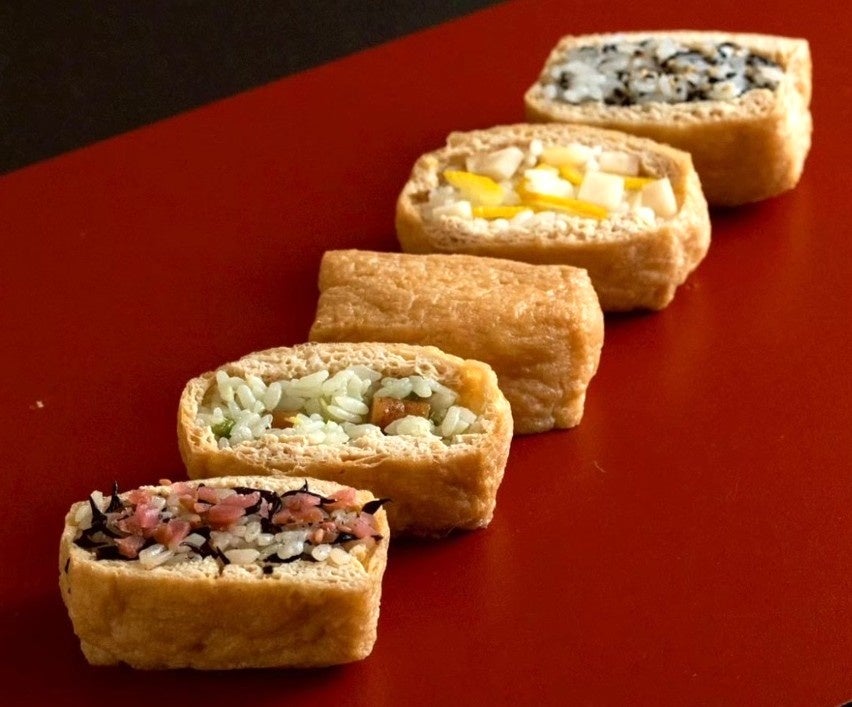 特製魚介だしが沁み渡るジューシーな出しいなり。今回はプレーンの他、わさびごぼう、梅ひじき、ガリ柚子、白黒ごまの5種類を用意しました。