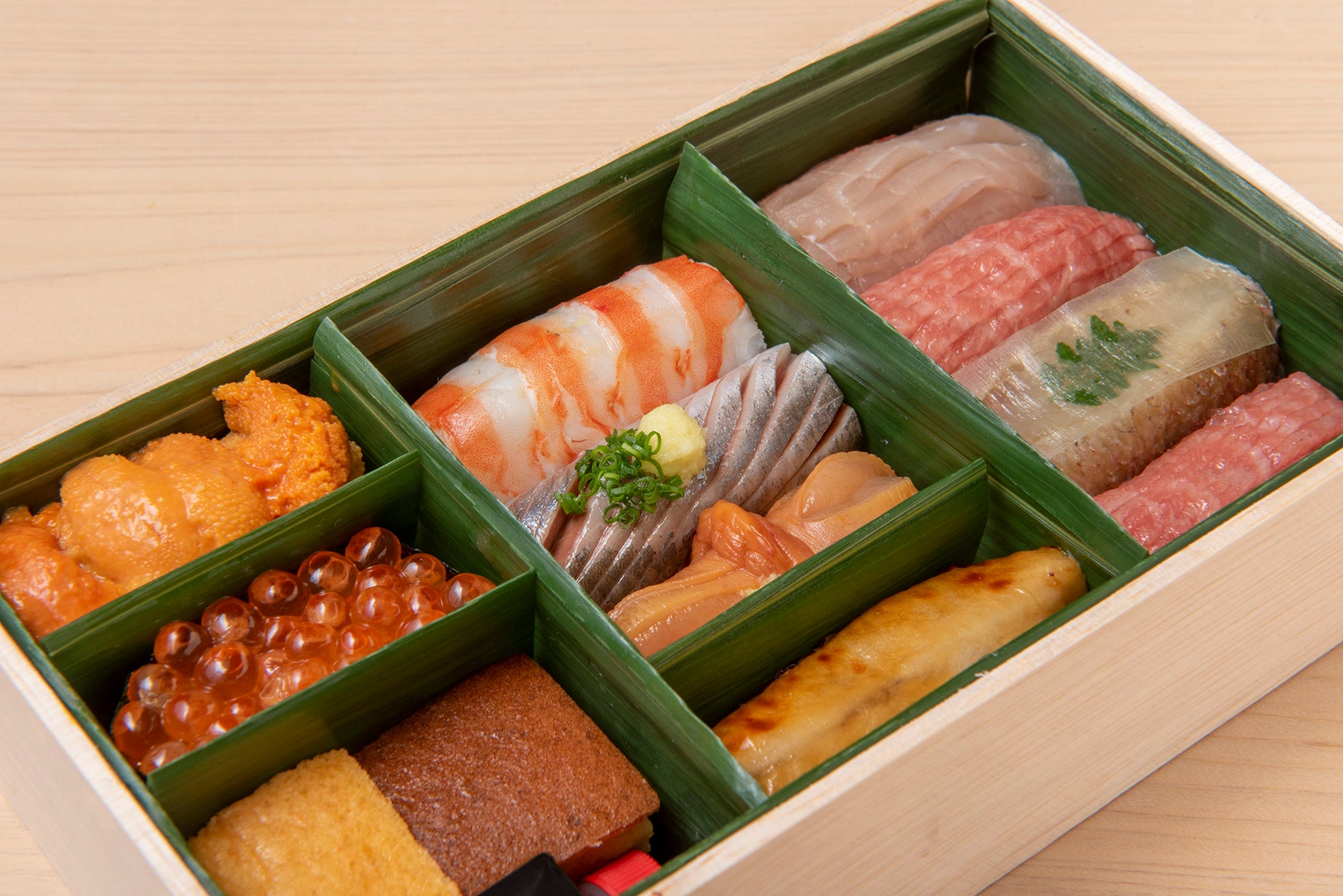 新鮮な国産本生まぐろの大トロとすき身、生うに、いくらをふんだんに使った一品。こだわりの純赤酢を使用したシャリにも注目。