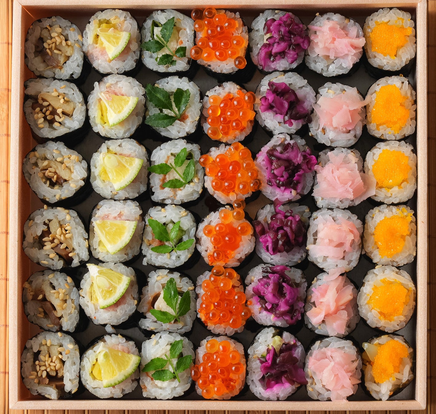 今回は、柚子酢飯を使用したこだわりのシャリを使い、椎茸穴子、ガリ鯖、とろたく、とろサーモン、黄金イカ、山芋梅、柴漬けきゅうりと様々な具材がぎゅっと詰まった細巻きをご用意。華やかな見た目は、おもたせやご褒美ごはんにもぴったり。
