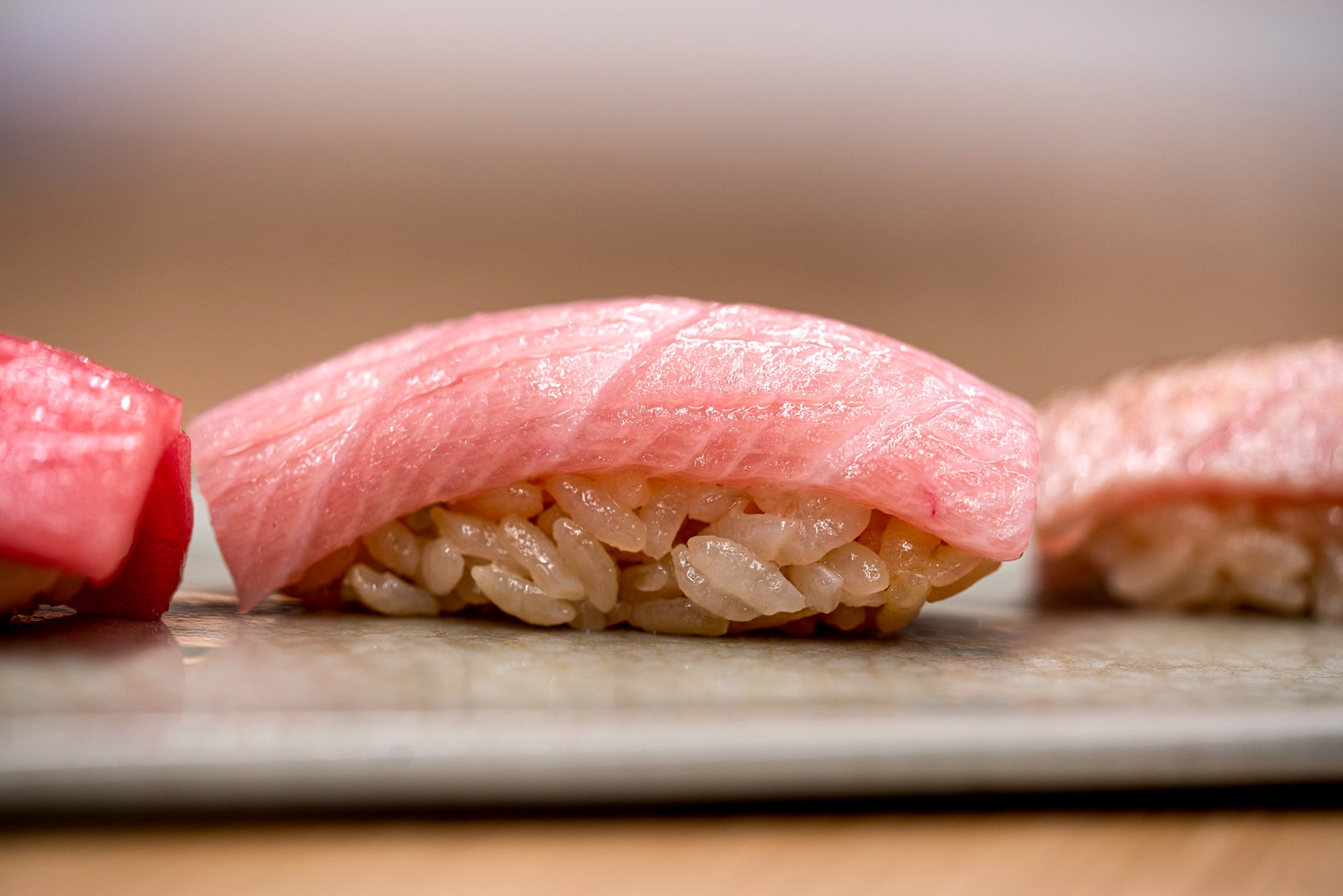 お肉の上には北海道産イクラに加え、深いコクと甘みが特徴のオシェトラキャビアをあしらいました。山形県が誇るブランド牛「米沢牛」A5ランクのみを使用。とろけるような脂の甘みと柔らかくさっぱりとした赤身のコントラスト。牛肉に合うよう独自の配合で仕上げたシャリは、上品な酸味と甘みが特徴です。