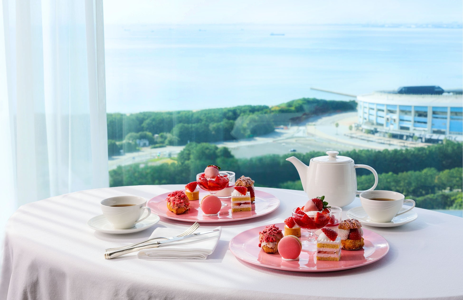 午後のティータイムにおすすめなのが、糖度が増す冬のいちごのおいしさをたっぷり味わえる「アフタヌーンティーセット」。フォトジェニックないちごスイーツやボリュームたっぷりの食事メニューを、東京湾を望むホテル最上階(24階)でお召し上がりいただけます。絶景を眺めながら優雅な午後のひとときをお過ごしください。