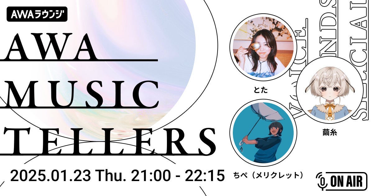 AWA株式会社(本社:東京都港区、代表取締役CEO:冨樫晃己)が運営する、サブスクリプション型(定額制)音楽ストリーミングサービス「AWA(アワ)」は、2025年1月23日21:00~22:15の約1時間に渡り、無料で誰でも参加できるオンライン空間「ラウンジ」で、アーティストと配信者の垣根を超えて心震わす弾き語りを得意とするシンガーが登場する公式番組『AWA Musictellers vol.6』を開催いたします。