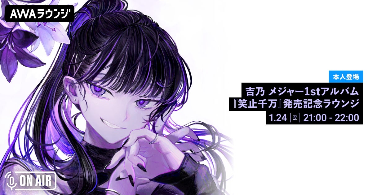 今回の番組は、1/22(水)リリースの吉乃メジャー1stアルバム『笑止千万』、のリリースを記念して開催されるもので、吉乃本人による生トークはもちろん、番組リスナー向けのプレゼントキャンペーンなど、盛りだくさんの内容でお届けします。AWAラウンジはどなたでも無料で参加することができ、AWAアプリを事前にダウンロードしていれば、リクエストやアーティストとの交流など、よりお楽しみいただけます。ぜひ、番組をお楽しみください。