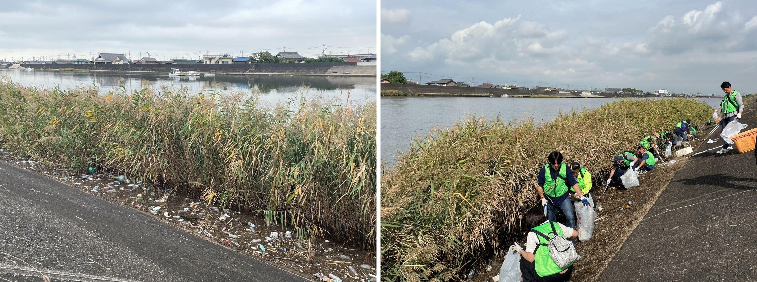 中堤会場の堤防は、河川ごみが藤前干潟やその先の海に流出する直前の重要なエリアです。堤防の岸辺にはヨシ(葦)が群生しており、一見すると遠くからはごみがあまり目立たないように見えます。しかし、実際に近くで堤防から川の様子を観察すると、ヨシの茂みに大量のペットボトルや空き缶、その他多種多様な漂着ごみが堆積しているのがはっきりとわかります。参加者たちは、そのごみの多さに驚きつつも「やりがいがある」と前向きに捉え、足元が悪い中でも積極的にごみを拾い続けました。