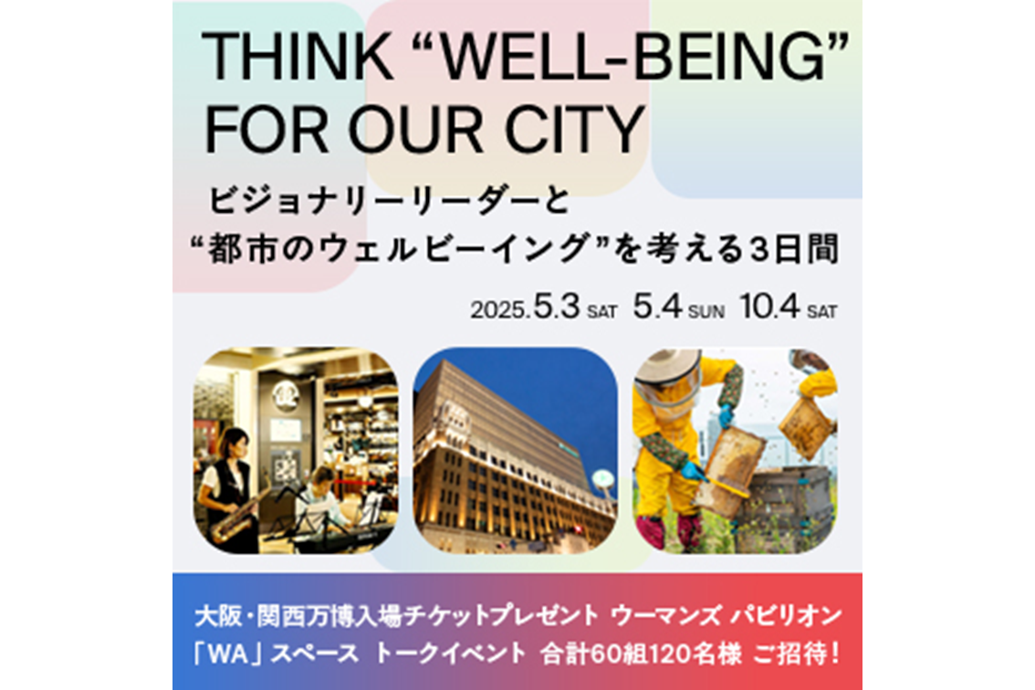 大丸心斎橋店では5月3日(土)、4日(日)、10月4日(土)の3日間、「WA」スペースをお借りして、これまでに取り組んできたESG活動の分野に精通する専門家やビジョナリーリーダーをゲストに迎え、「THINK “WELL-BEING” FOR OUR CITY〜都市のウェルビーイングを考える〜」をテーマにトークショーや小学生向けのワークショップを行います。イベントには、抽選で合計60組120名様をご招待いたします。