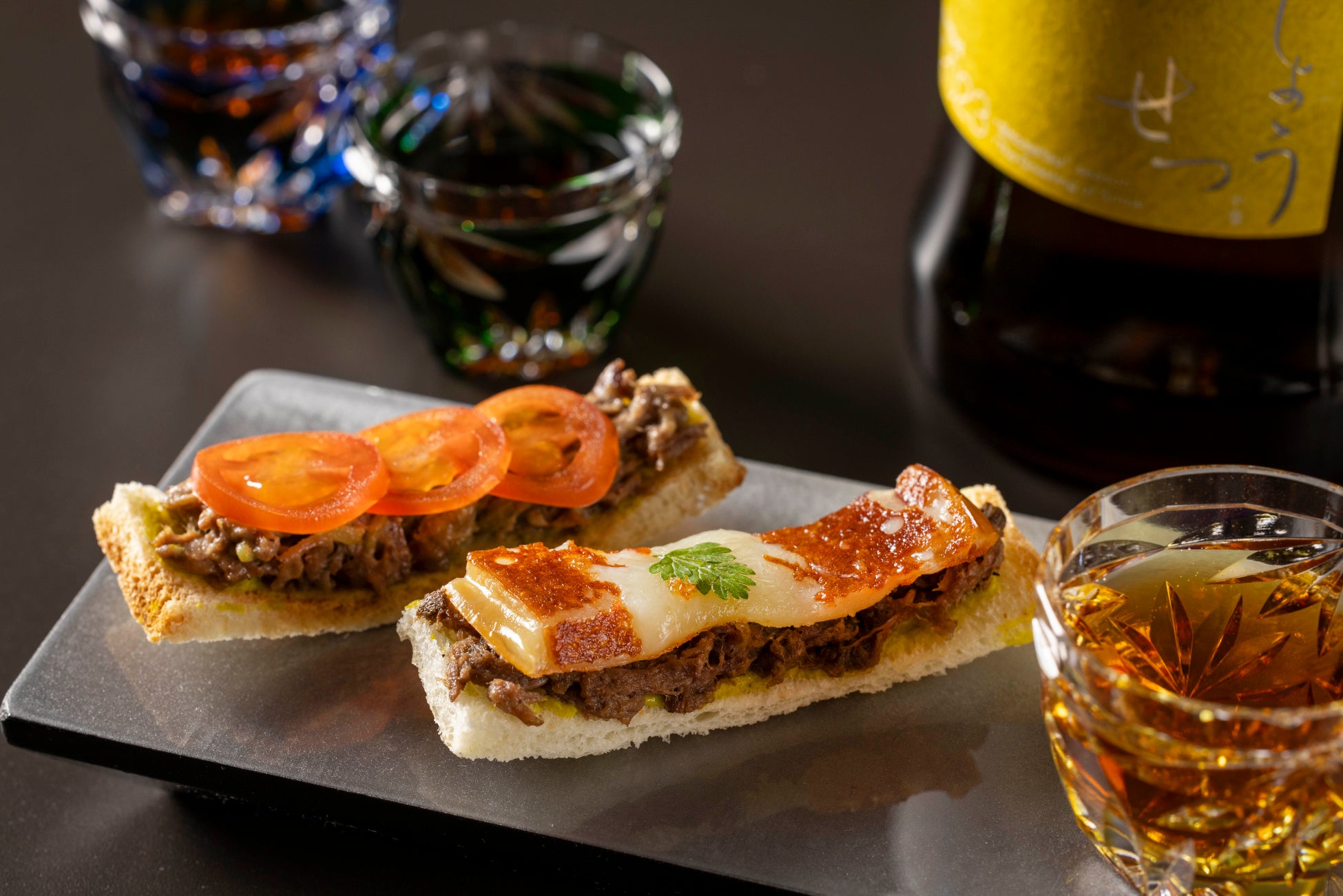 同じ北海道の地、厚岸でつくられたウイスキーと釧路 蝦夷鹿のマリアージュを楽しめる、2種のコンヴェニソンをご用意しました。写真左は、グリーンマスタード、コンヴェニソンに絡めた自家製ソース、そして最後にのせたミニトマトのそれぞれの酸味と鹿肉の旨味が絶妙にマッチするアレンジ。写真右は、醬油漬けされた実山椒がピリッと効き、表面を軽く焼いた北海道産カチョカバロの燻製香が特徴的な和のアレンジ。ピート感がある厚岸ウイスキーと好相性の、スモーキーで深みのある贅沢なペアリングをご賞味ください。
