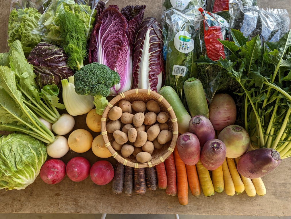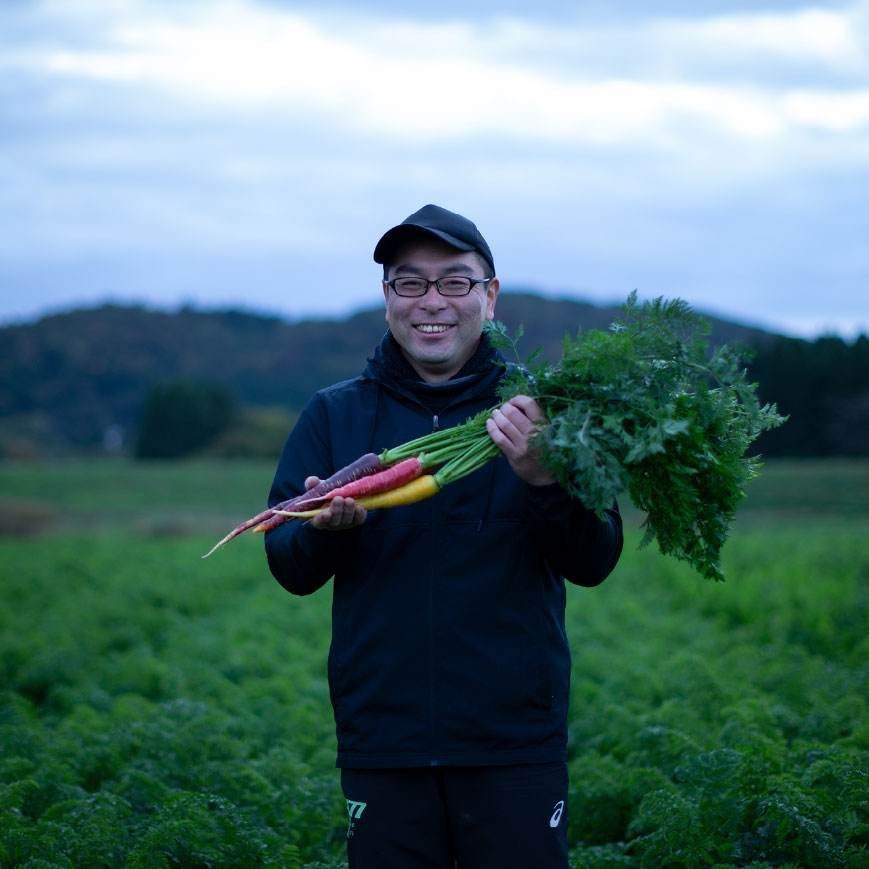 岩手県北上市の「うるおい春夏秋冬」は、有機肥料を用いた土づくりを基本に、年間を通じて数十品目を栽培しています。しっかりとした味わいの野菜は料理人からも評価されており、気候変動や温度差の大きい環境下で多品目を育てる難しさに向き合いながら、生産技術の改善を続けています。今回の出品では、秋冬の自信作である各種のカブや特徴ある西洋野菜をぜひ味わってください。