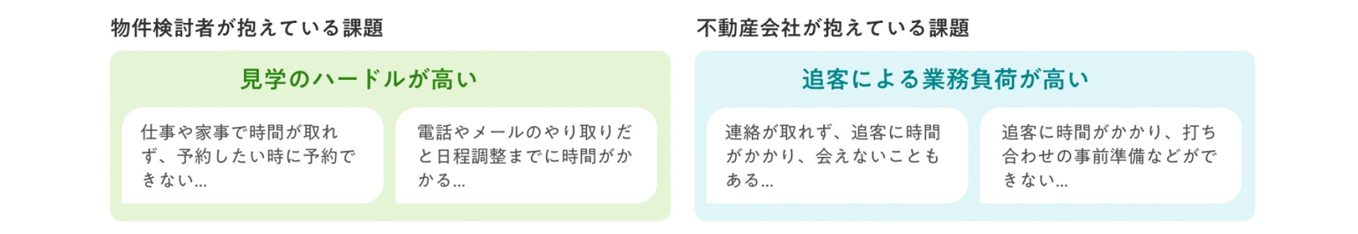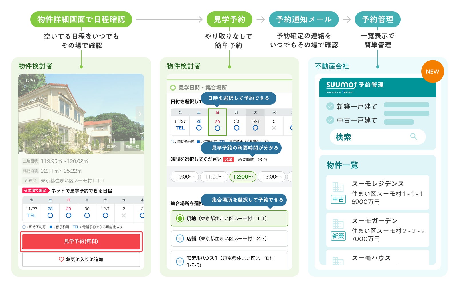 これまで『SUUMO』ユーザーが新築・中古一戸建てや中古マンション、土地を探す際は、資料請求してから見学希望日を電話やメールなどで不動産会社に伝える必要があり、実際に見学するまでにやりとりが何度も発生していました。不動産会社にとっても、まだ検討段階で資料請求だけをしたい方とすぐに物件の見学をしたい方を判別することが難しく、まだ見学を希望していない方を含めて多くの電話やメールのやりとりなどのアナログな作業を行う必要がありました。その結果、「日程調整をしているうちに希望物件が売れてしまった」「購入検討者に何度か電話したが、つながらないため購入意欲が低いと判断した」といった擦れ違いが発生していました。