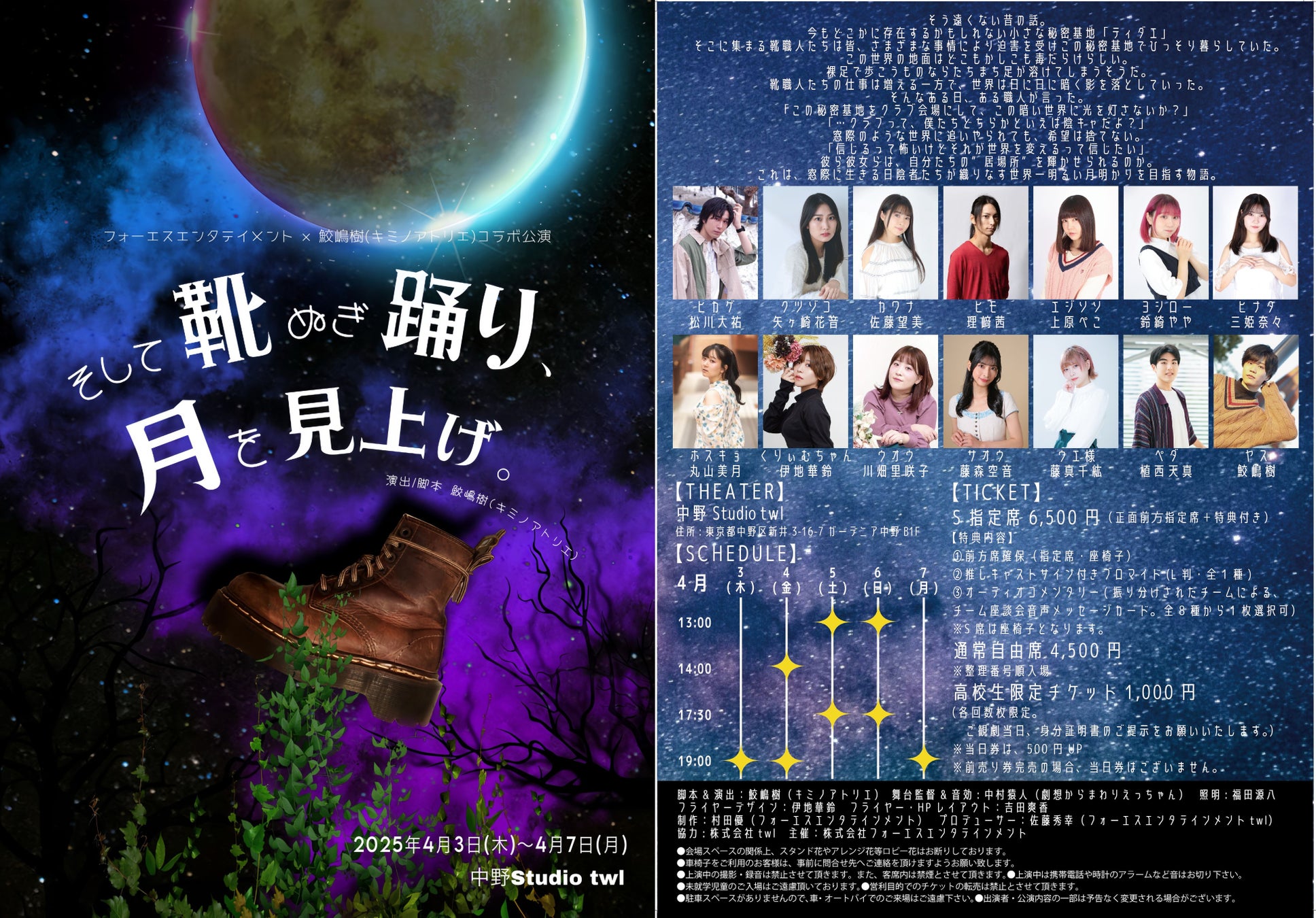 【株式会社フォーエスエンタテイメント×キミノアトリエ】コラボレーション作品 舞台『そして靴ぬぎ踊り、月を見上げ。』が2025年4月3日 (木) 〜 2025年4月7日 (月)に中野Studio twl(東京都 中野区 新井 3-16-7 B1F)にて上演されます。