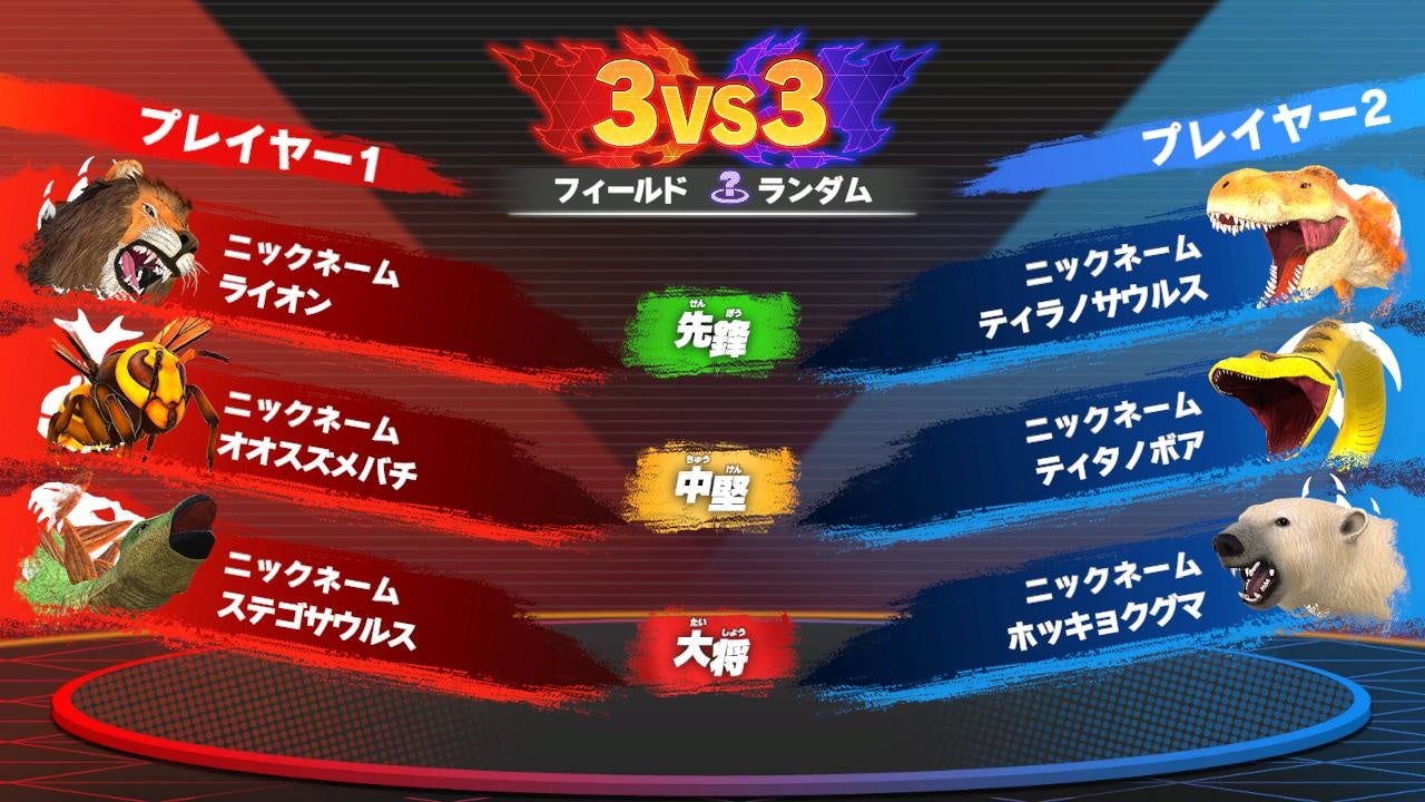 プレイヤー同士が、生物を3体ずつ出し合って、1対1の対戦を行い、勝った方は次の生物と戦う勝ち抜き戦形式です。最後まで生物が残ったほうが勝ちになります