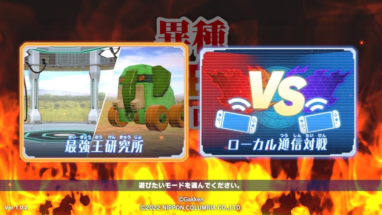 今回の無料アップデートを行っていただき、ゲームを起動して頂くと、タイトル画面で、従来のゲームを遊ぶ「最強王研究所」と、プレイヤー同士の対戦がお楽しみ頂ける「ローカル通信対戦」の2つのメニューが表示されるようになります。