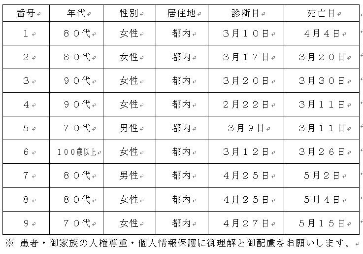 都内で新型コロナウイルスに感染した方が死亡されましたのでお知らせします。
