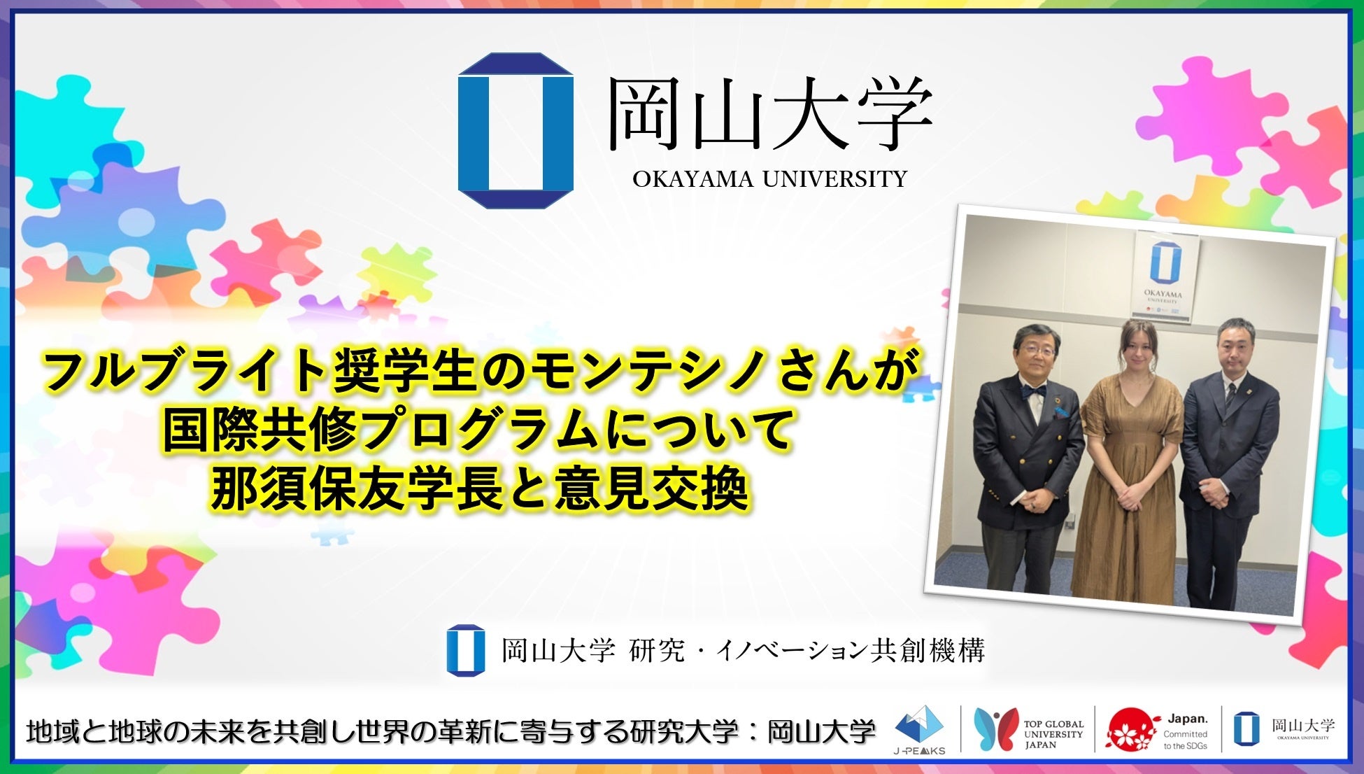 国立大学法人岡山大学(本部:岡山市北区、学長:那須保友)は、2025年3月18日、フルブライト奨学生でスタンフォード大学のグローバル人材育成プログラム(SPICE)の講師を務めるナタリー・モンテシノさんが、那須保友学長と国際共修に関する意見交換を行いました。