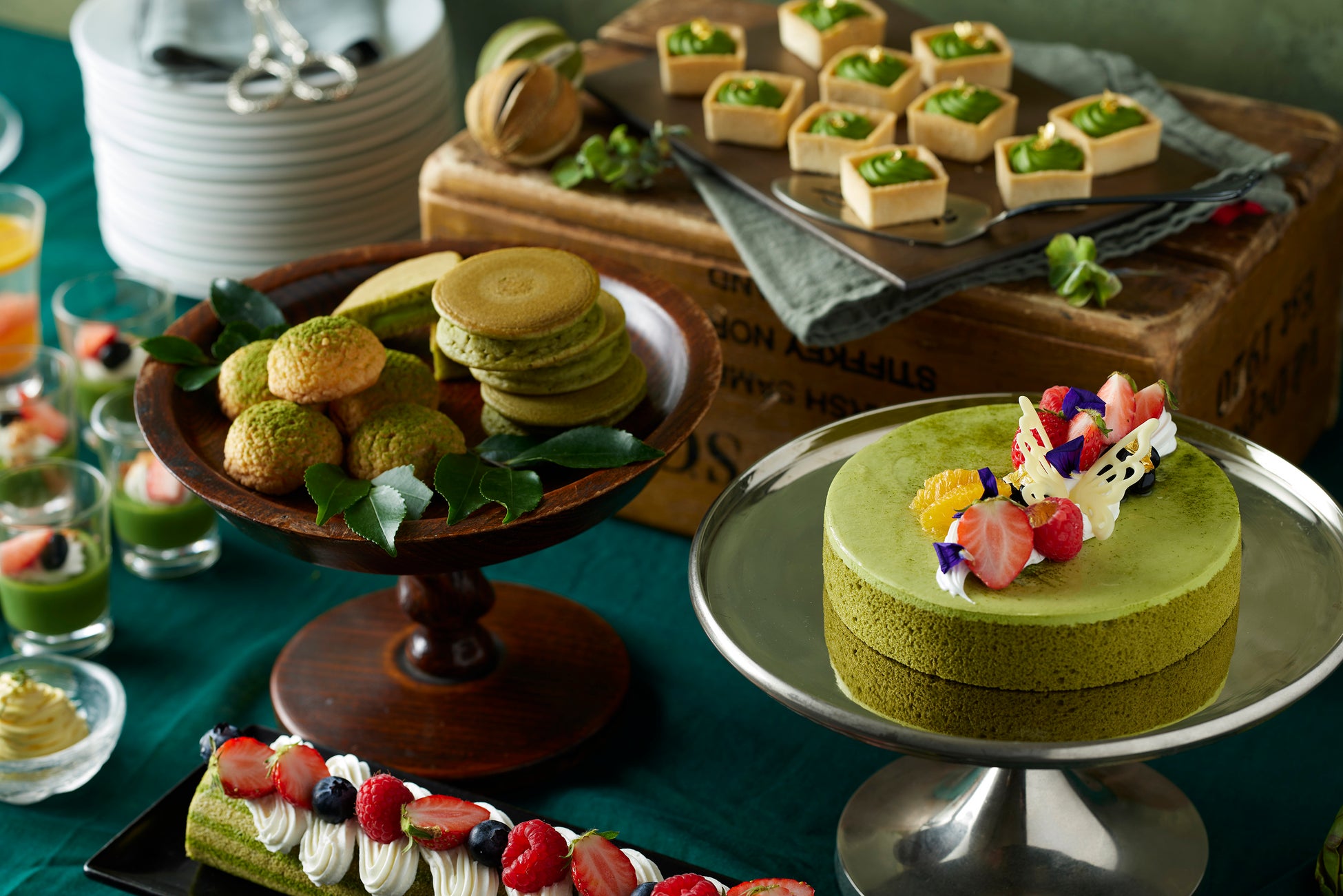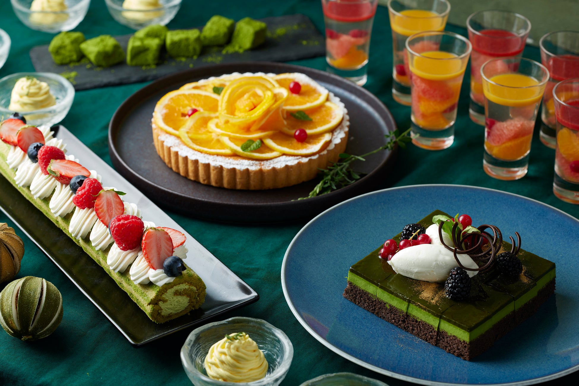 2023年5月1日(月)~6月30日(金)の期間中、人気のデザートブッフェでは「宇治抹茶のロールケーキ」や「宇治抹茶のムース」など抹茶の香り豊かなスイーツのほか、「柑橘フルーツゼリー」「カシスムース」「オレンジタルト」など、柑橘フルーツの爽やかな味わいをご堪能いただけます。