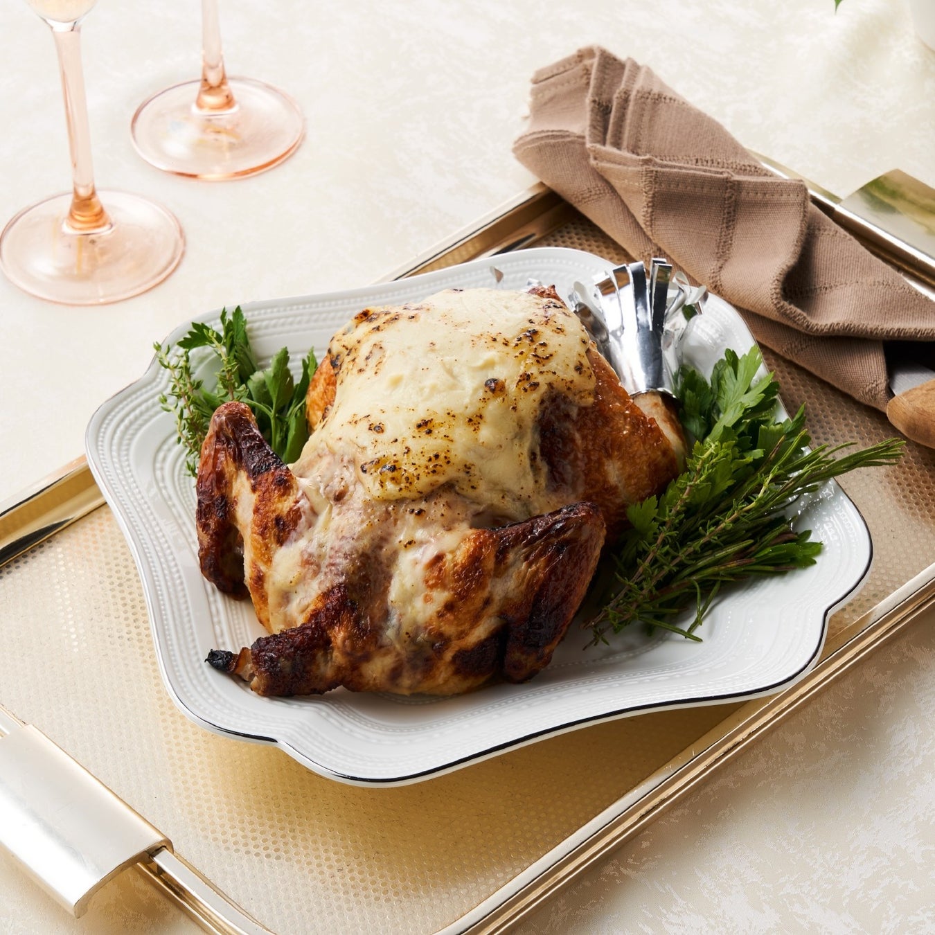 チキン丸ごと1羽に塩麹とオリジナルハーブミックスでしっかり下味をつけ、オーブンで肉汁を閉じ込めて焼き上げました。ふっくらやわらかくジューシーなローストチキンに、パルメザンやゴーダなど食べやすい数種のチーズとリッチクリームをブレンドしたオリジナルソースをかけてこんがりと焼き上げた贅沢な一品です。