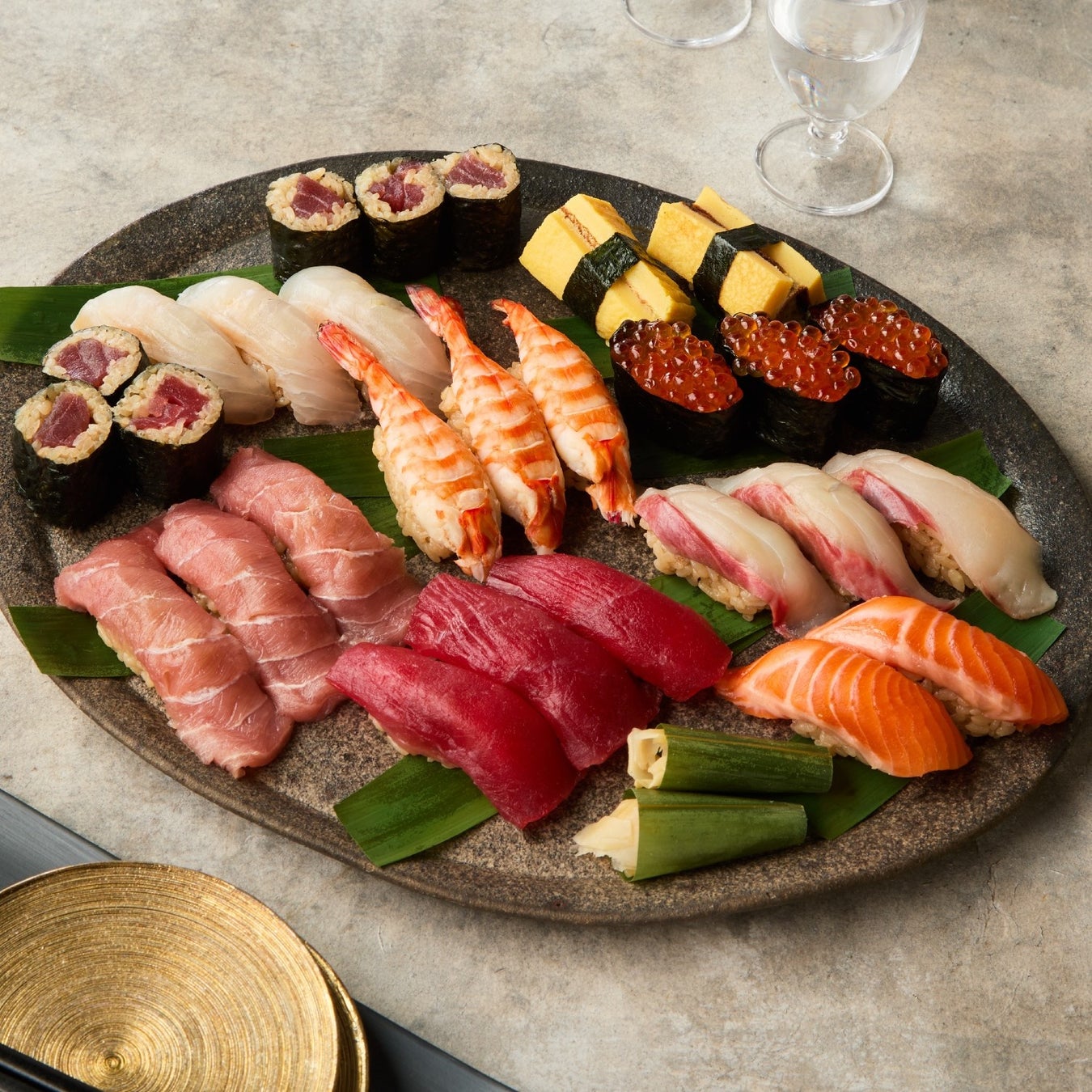 冬のクリスマス用ですので、あえて生のネタ(鮪、白身、サーモン、イクラ)をメインにそろえながら、寿司政の車海老、玉子を揃えます。クリスマスらしい彩の赤(鮪、車海老、イクラ、鉄火巻き)を中心に、白(白身)、ピンク(サーモン)、黄(玉子)で桶盛の華やかな色彩を演出します。