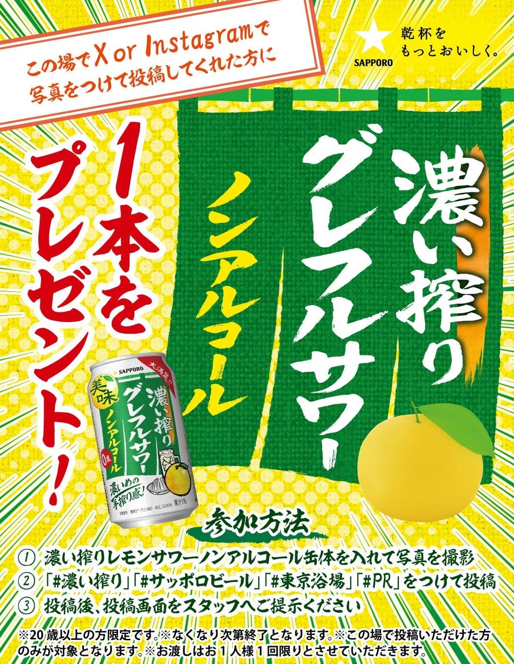 上記期間中に東京浴場にお越しいただいた皆様のうち、下記の方法でXまたはInstagramに写真を投稿いただいた方には追加で「サッポロ 濃い搾りグレフルサワー ノンアルコール」350ml缶をプレゼント。
