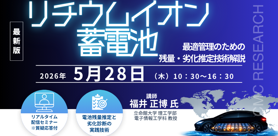 【ライブ配信/ZOOM】「リチウムイオン蓄電池最適管理のための残量・劣化推定技術解説…動作原理、モデル化と制御手法を中心に電池別、用途別観点を入れて」セミナー開催!5/28(木)主催:CMCリサーチ