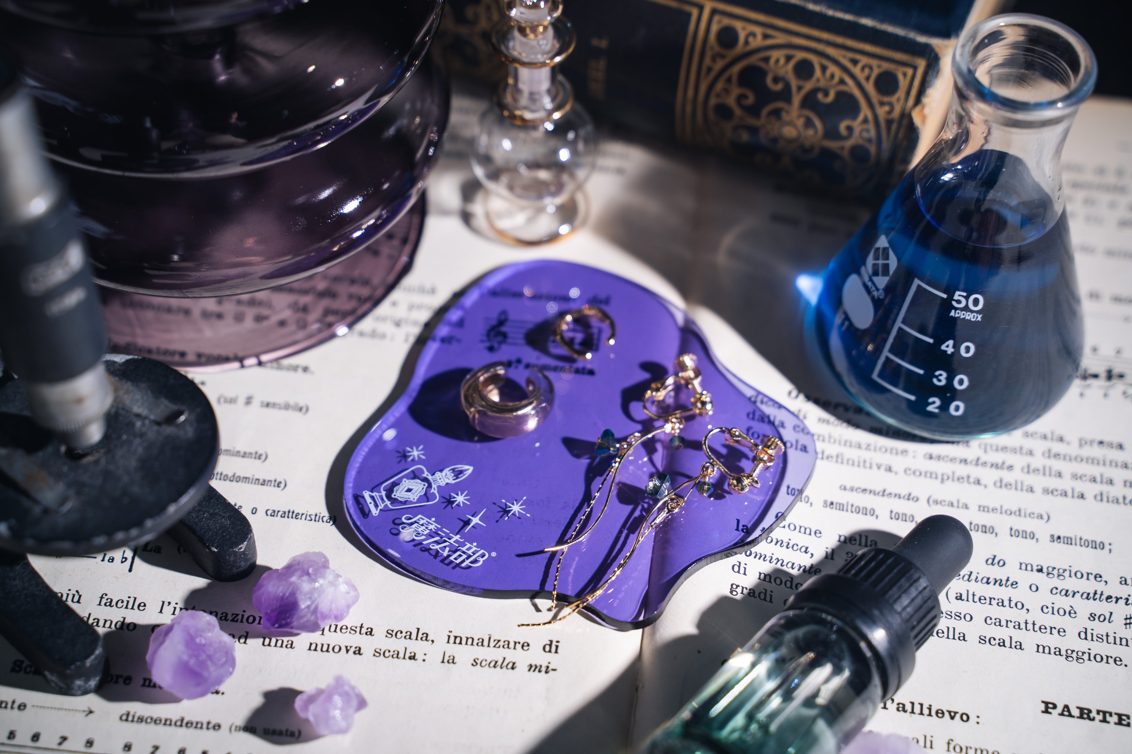 ポーション(=ファンタジー界で“一服の霊薬”の意)がこぼれたかのように広がるデザインのコースターです。ミステリアスなパープルで、アクセサリートレーとしても使えます。