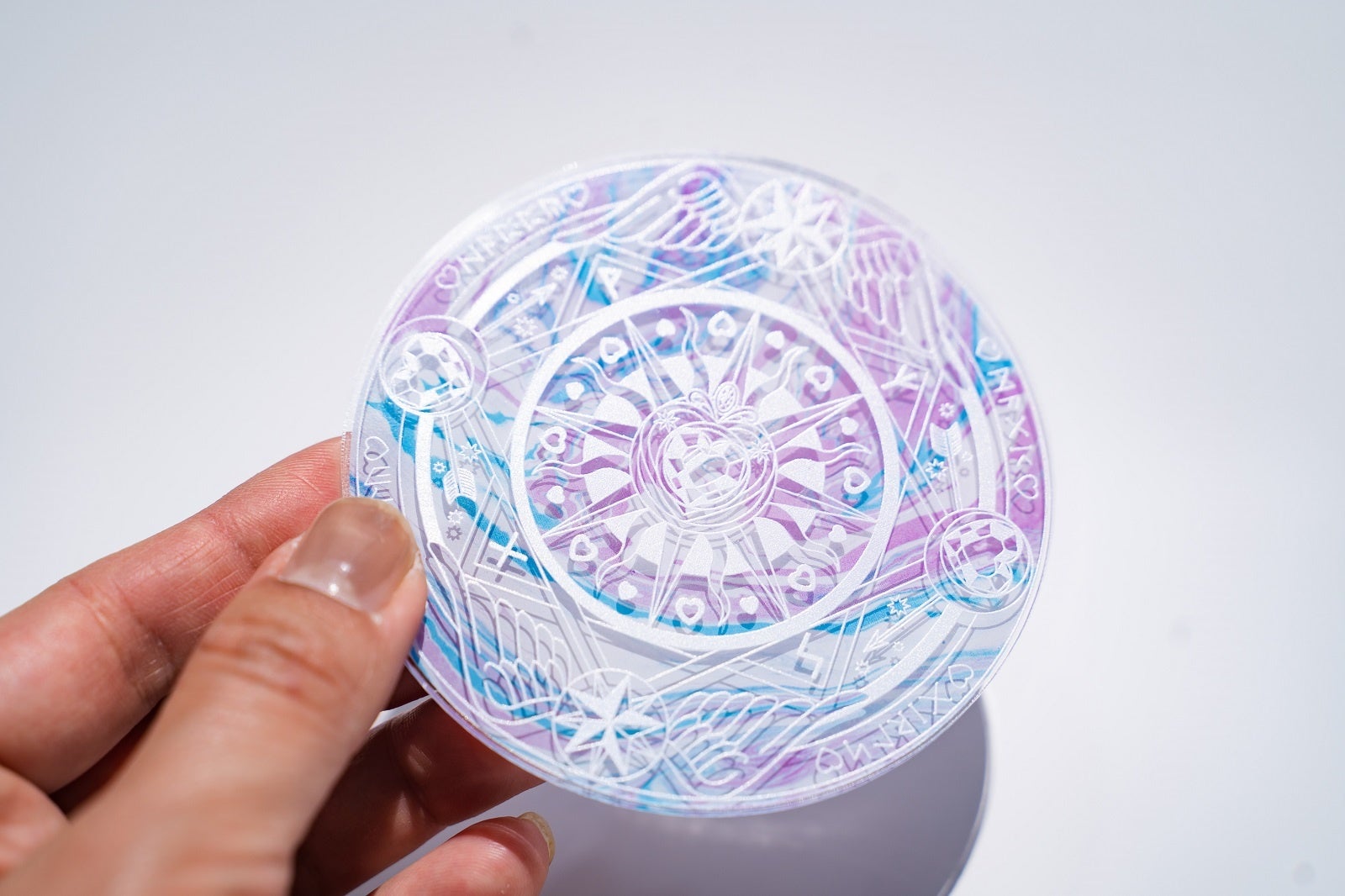 ピンクとブルーのマーブル模様に、かわいい魔法陣をデザインした魔法陣コースターです。魔法少女の変身シーンのように、フィギュアやぬいぐるみを飾っても。