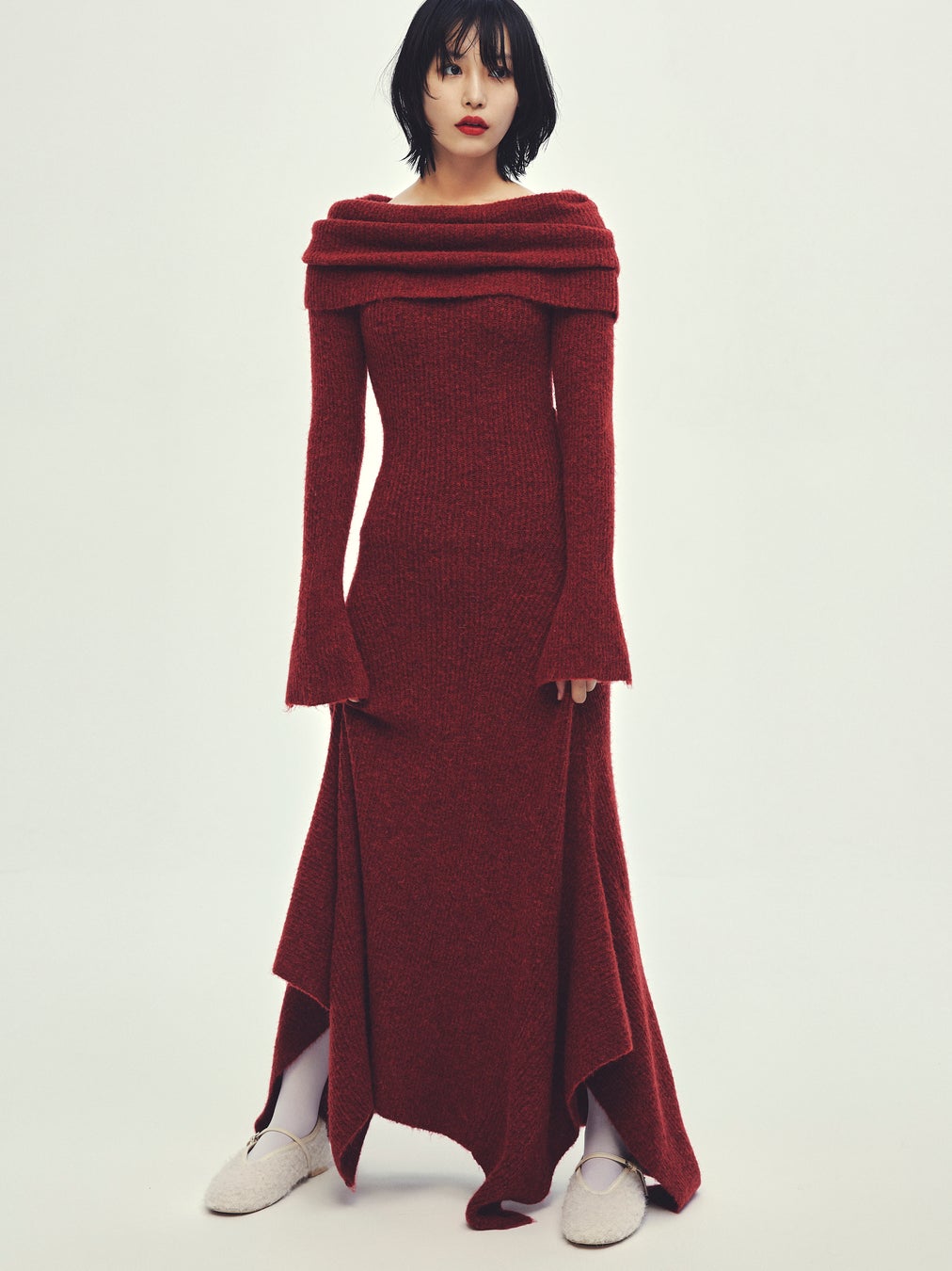 ホリデールックにもおすすめのオフショルデザインは華やかさも感じらる一枚。アシメヘムラインで動きをプラスした女性らしさと、ふわっとした風合いで包まれるような着心地のニットドレス。