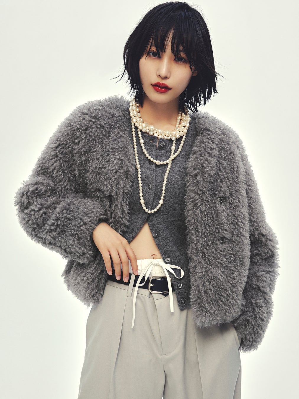 ファーならではのウォーミーなかわいさにバックルデザインのカジュアルさがプラスされたファージャケット。インナーパンツがちらりとのぞく重ね着風のデザインパンツと合わせれば、トレンドを意識した上級なカジュアルスタイルに。