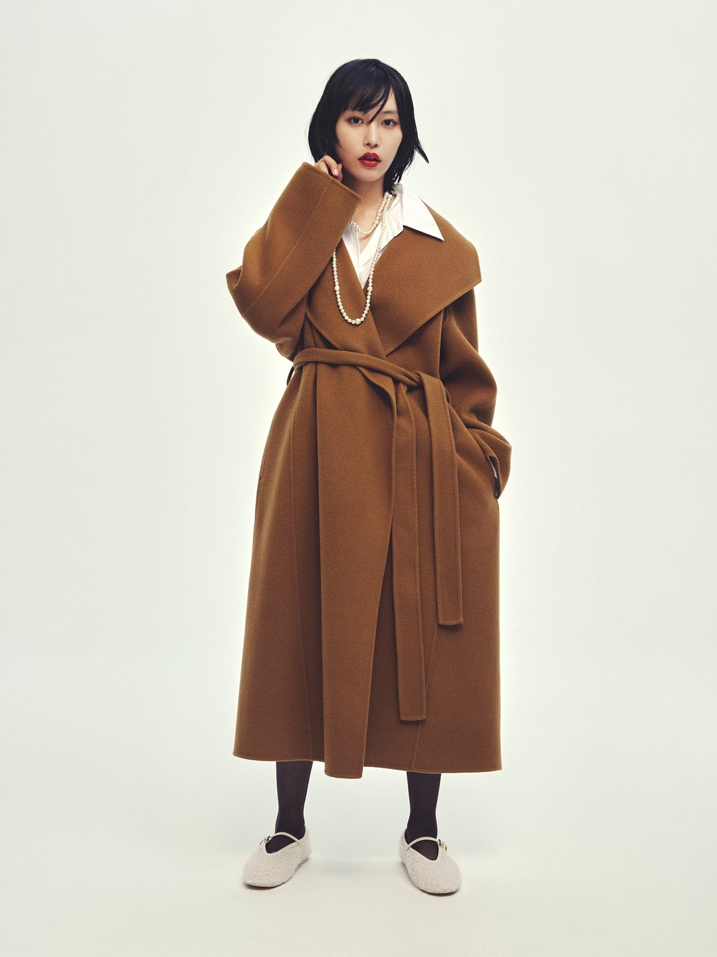 ウエストベルト付きのリバーコートはオーバーすぎないシルエットでどんなコーデでも取り入れやすいマストアイテム。ウール100%のため暖かい一枚。