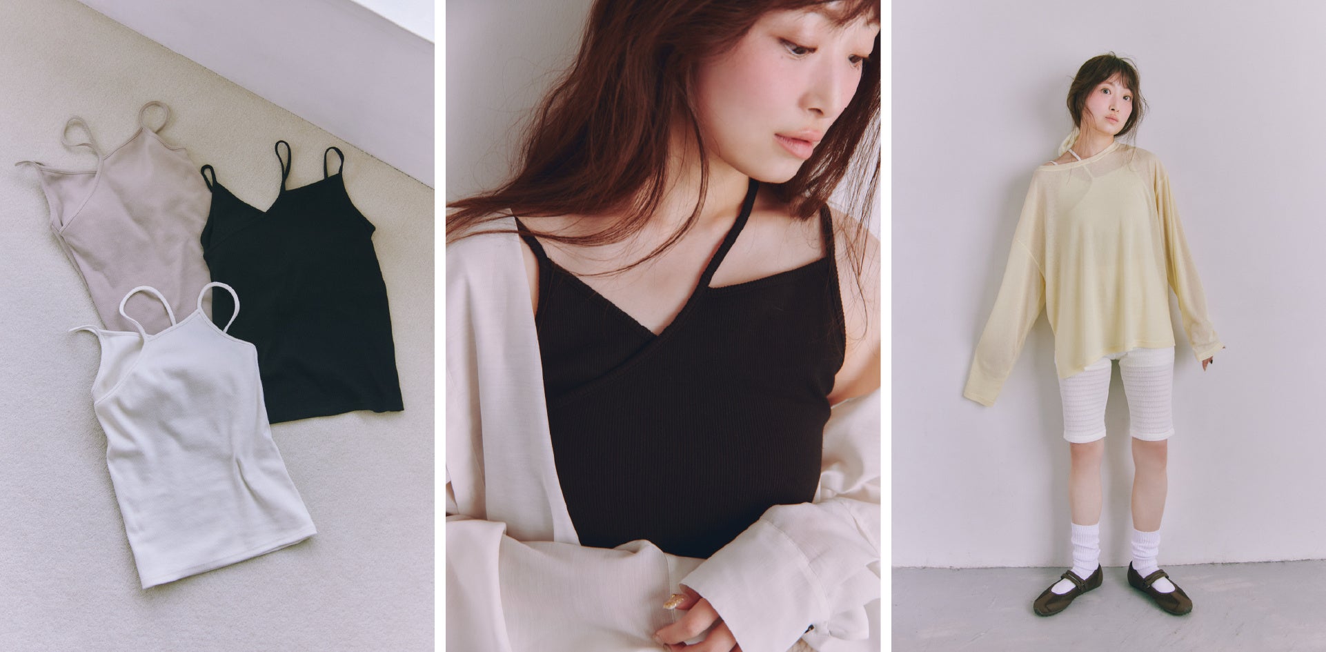 アシメデザインがスタイリングのポイントになってくれるカップ付きインナー。デザイン性はありつつも着やすいベーシックカラー展開にしているので、幅広いスタイリングに合わせやすい1 着です。伸縮性に加えカップも取り外し可能な仕様にするなど、機能性にもこだわりました。