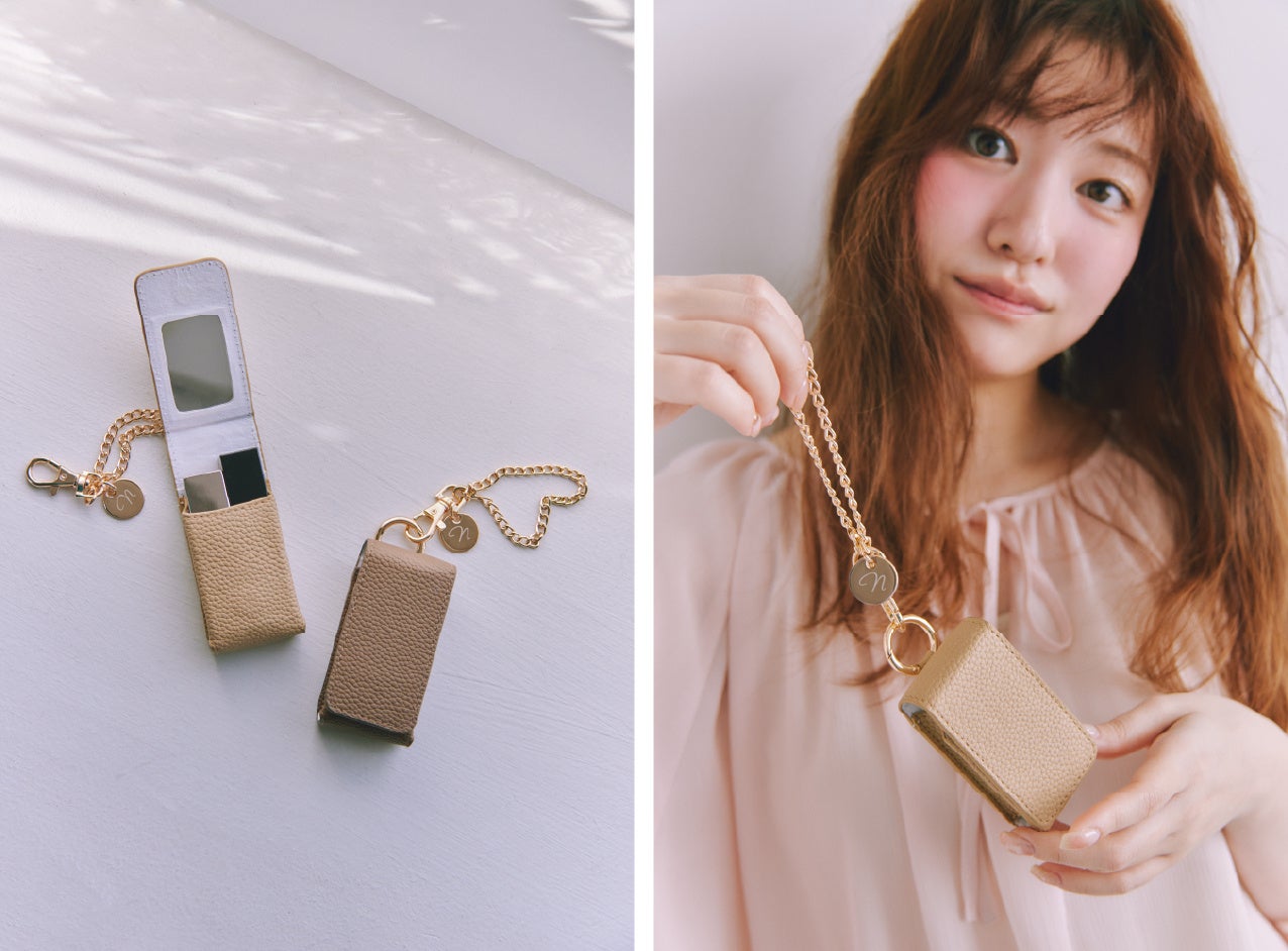 リップが約2 本入るサイズ感で、取り外し可能なオリジナルチャーム付きなのでバッグの中に入れてポーチとしても、チャーム感覚で付けても“カワイイ”デザイン。ミラー付きなので、外出先でのリップ直しにも便利です。