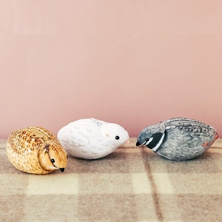 ぽてっとしたフォルムがかわいいヒメウズラの姿をリアルに再現した手のひらサイズのポーチです。