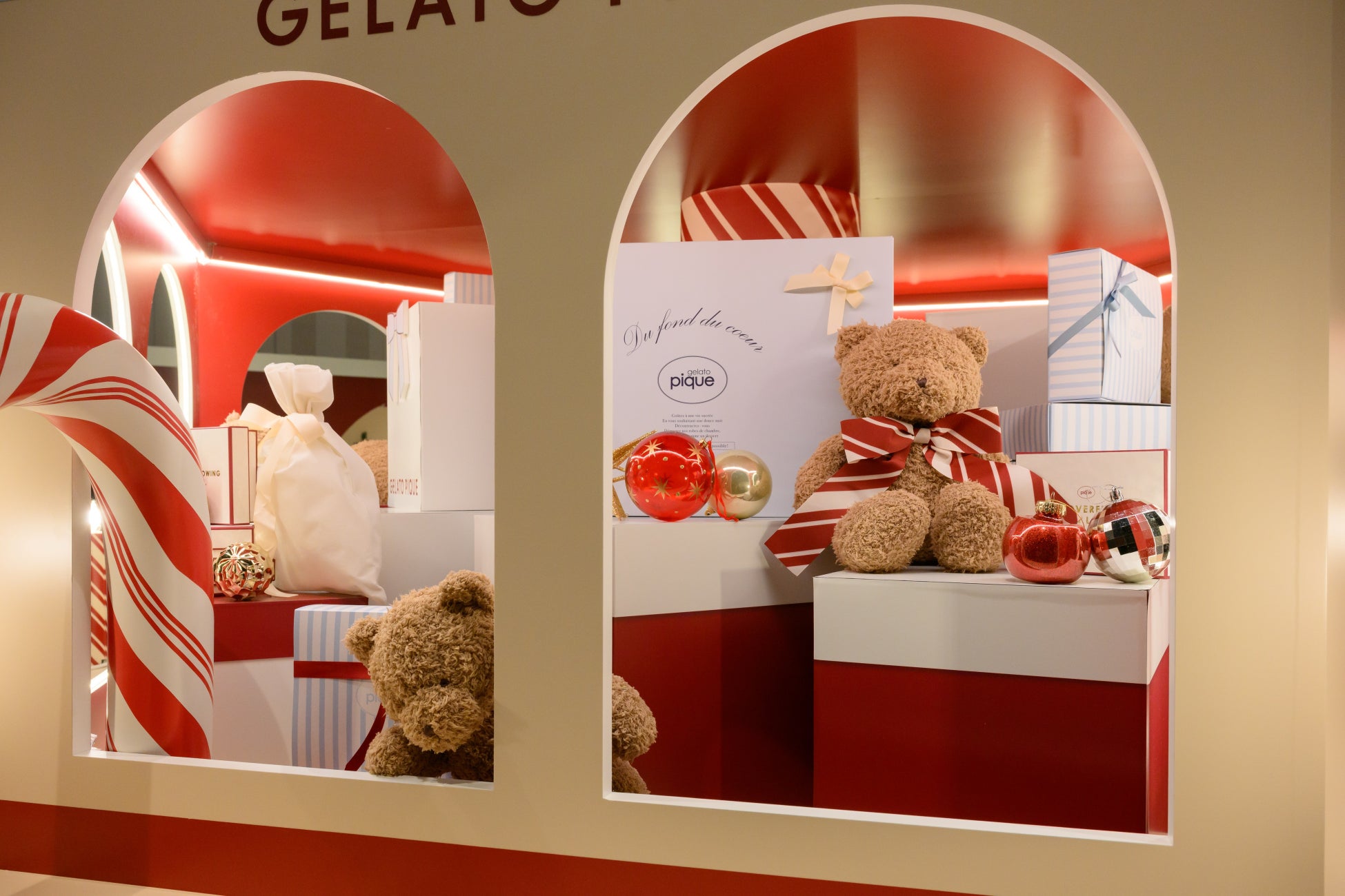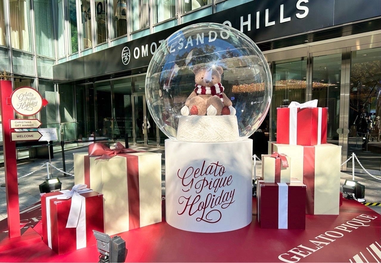 表参道ヒルズのエントランスでもGELATO PIQUE CHRISTMAS GIFT MARKET 2024の世界観をお届けする、ギフトボックスやケーキの上にちょこんと座るベアが愛らしいスノードームを展示。