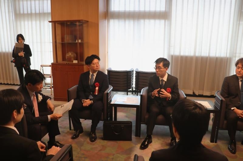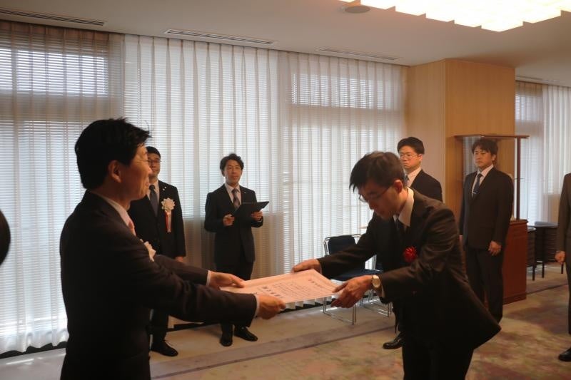 岡山県出身の物理学者、故仁科芳雄博士の偉業を顕彰し、人物・成績ともに優秀な県内在学の理工系大学院修了予定者に贈られる「令和6年度仁科賞」の授与式が2025年3月18日、岡山県庁で行われ、本学大学院自然科学研究科博士後期課程の田偉航さんと同研究科でOU-SPRING生※でもある内藤秀文さんに伊原木隆太知事が賞状とトロフィーを手渡しました。