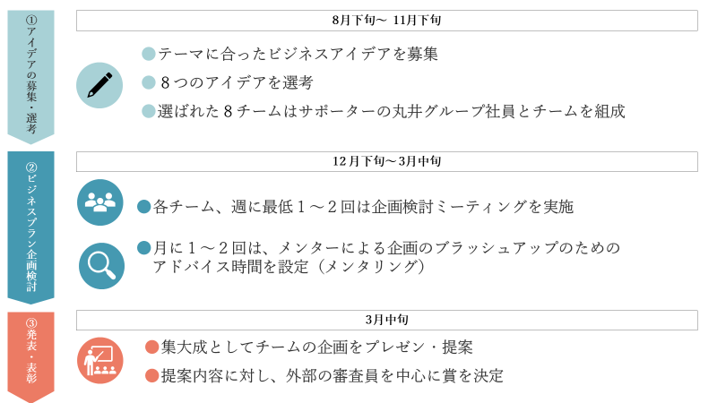 選考を通過したチームは、サポート役の丸井グループ社員とチームを組み、約3カ月間、新規事業のプランを企画します。