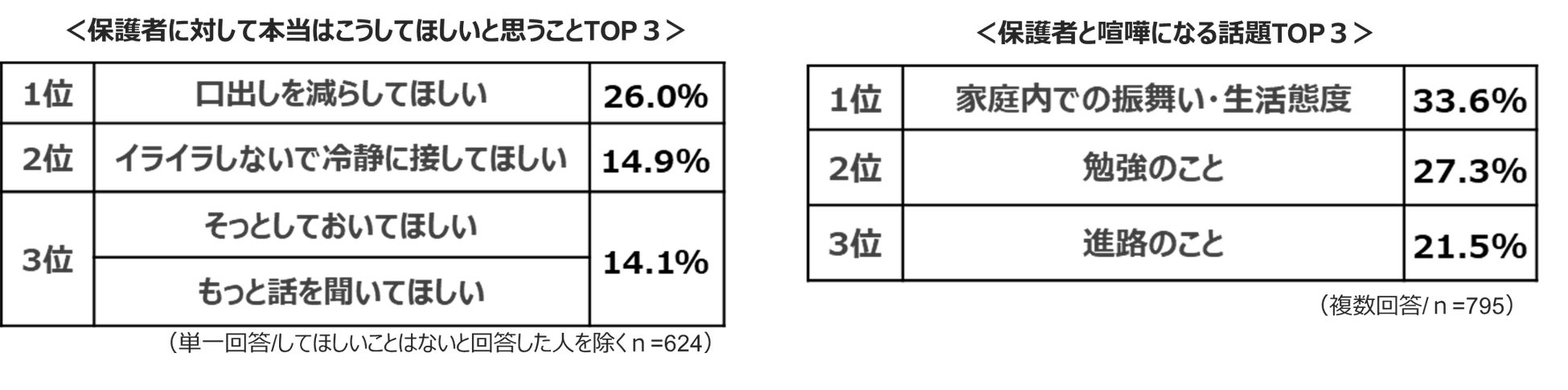高校生に「保護者にしてほしいと思うこと」を尋ねた結果、「口出しを減らして」「イライラせず冷静に」「そっとしておいて」といった回答が続きました。こと「反抗期」というテーマについて聞いた今回の結果では、保護者からの注意をやや疎ましく感じている様子や直接的な対立や感情的なコミュニケーションを避けたいと考えている様子が浮かんできました。